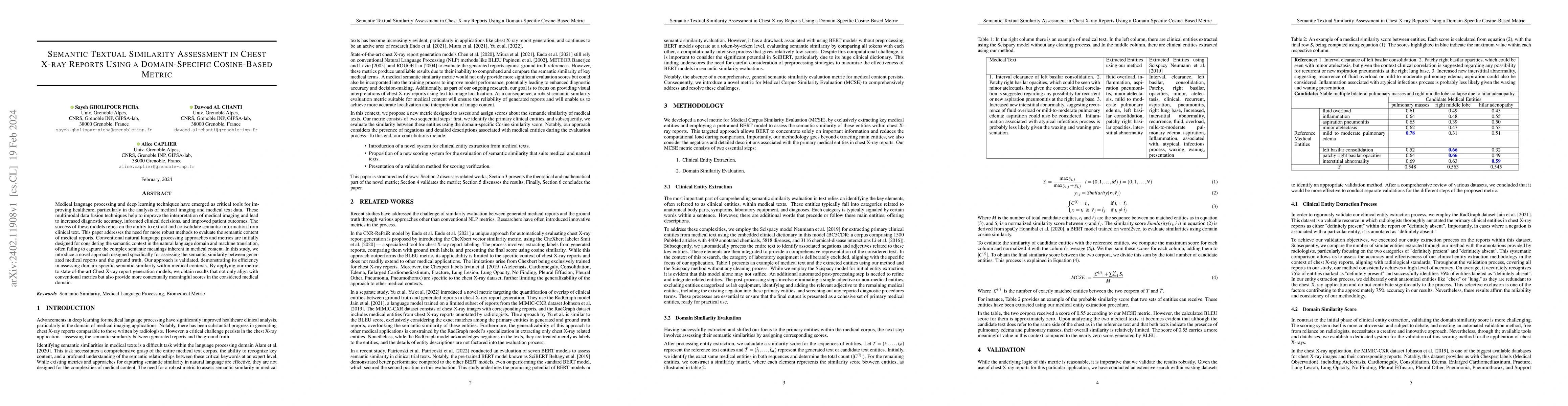 Medical language processing and deep learning techniques have emerged as critical tools for improving healthcare, particularly in the analysis of medical imaging and medical text data. These multimodal data fusion techniques help to improve the interpretation of medical imaging and lead to increased diagnostic accuracy, informed clinical decisions, and improved patient outcomes. The success of these models relies on the ability to extract and consolidate semantic information from clinical text. This paper addresses the need for more robust methods to evaluate the semantic content of medical reports. Conventional natural language processing approaches and metrics are initially designed for considering the semantic context in the natural language domain and machine translation, often failing to capture the complex semantic meanings inherent in medical content. In this study, we introduce a novel approach designed specifically for assessing the semantic similarity between generated medical reports and the ground truth. Our approach is validated, demonstrating its efficiency in assessing domain-specific semantic similarity within medical contexts. By applying our metric to state-of-the-art Chest X-ray report generation models, we obtain results that not only align with conventional metrics but also provide more contextually meaningful scores in the considered medical domain.