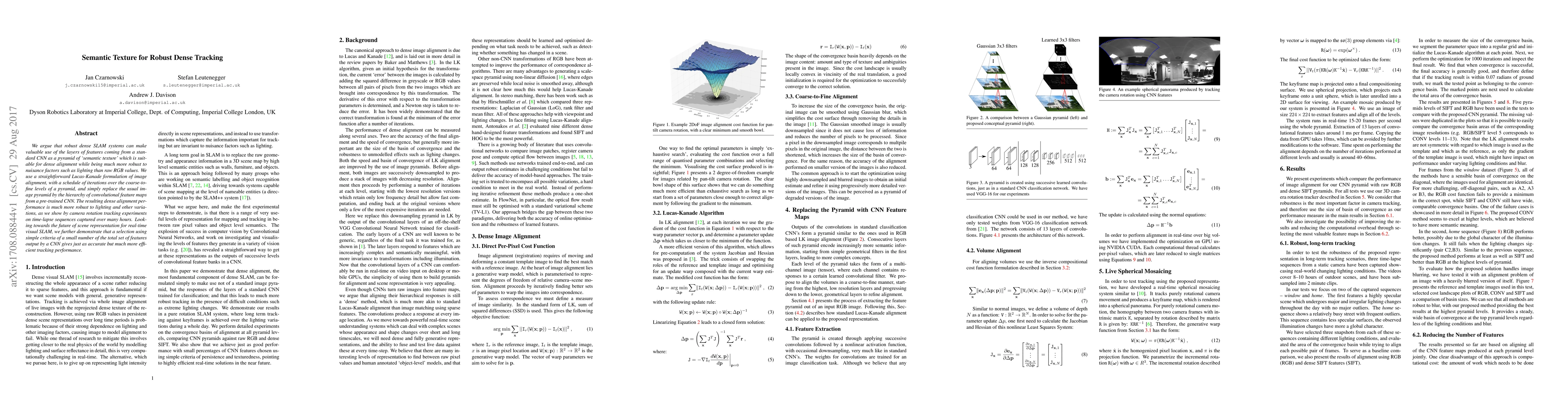 This paper proposes using a CNN's convolutional feature maps as a "semantic texture" pyramid for robust dense SLAM, replacing traditional image pyramids. The method leverages a Lucas-Kanade formulation for dense alignment, showing improved performance under varying lighting conditions through extensive camera rotation tracking experiments.