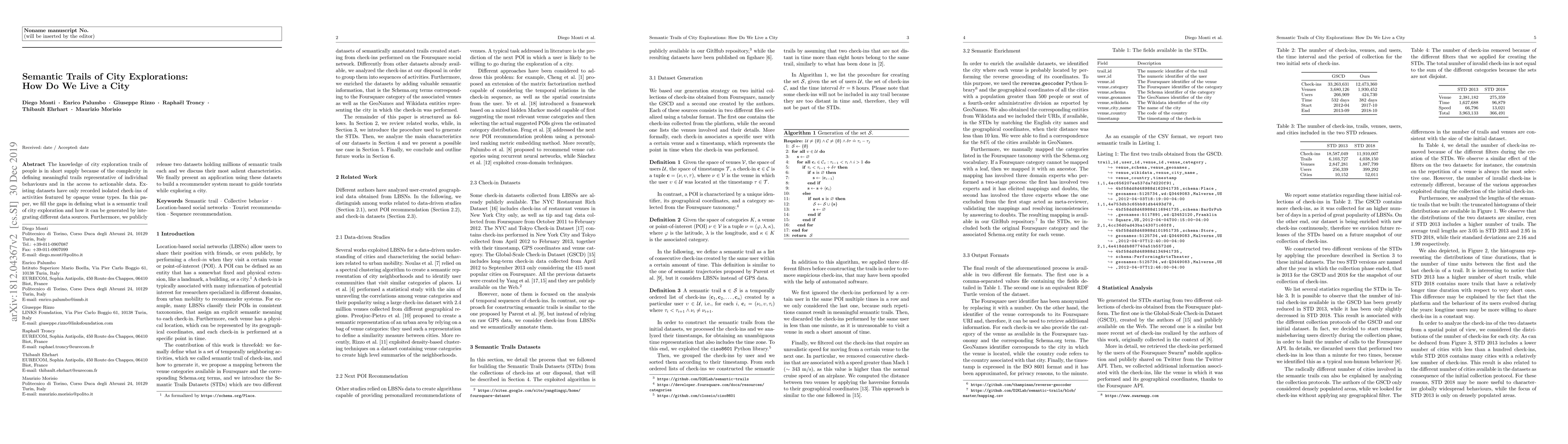 The knowledge of city exploration trails of people is in short supply because of the complexity in defining meaningful trails representative of individual behaviours and in the access to actionable data. Existing datasets have only recorded isolated check-ins of activities featured by opaque venue types. In this paper, we fill the gaps in defining what is a semantic trail of city exploration and how it can be generated by integrating different data sources. Furthermore, we publicly release two datasets holding millions of semantic trails each and we discuss their most salient characteristics. We finally present an application using these datasets to build a recommender system meant to guide tourists while exploring a city.