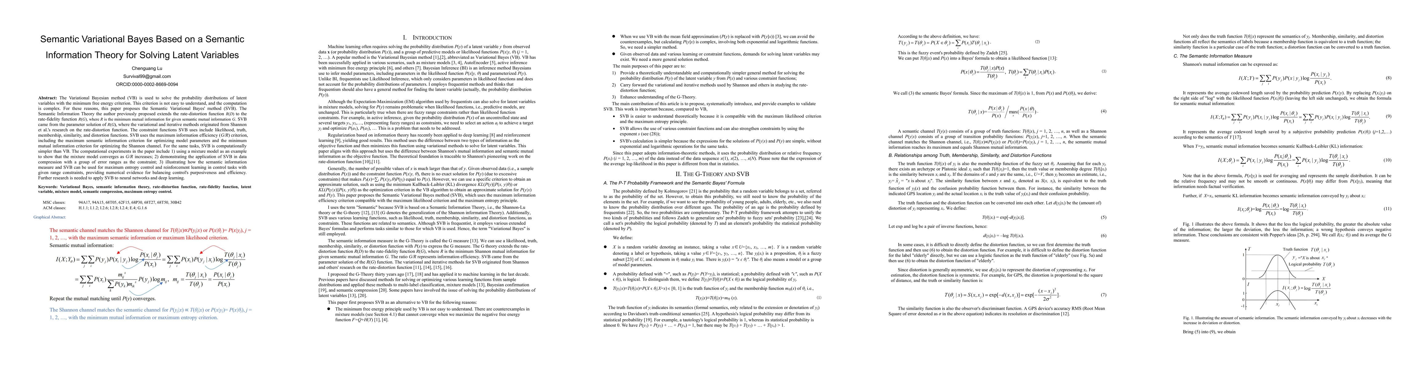 This paper proposes the Semantic Variational Bayes (SVB) method to simplify the computation of latent variable probability distributions compared to traditional Variational Bayesian (VB) methods. SVB employs Semantic Information Theory to use a maximum information efficiency criterion, offering a more comprehensible and efficient approach for tasks such as mixture model convergence, data compression, and reinforcement learning.