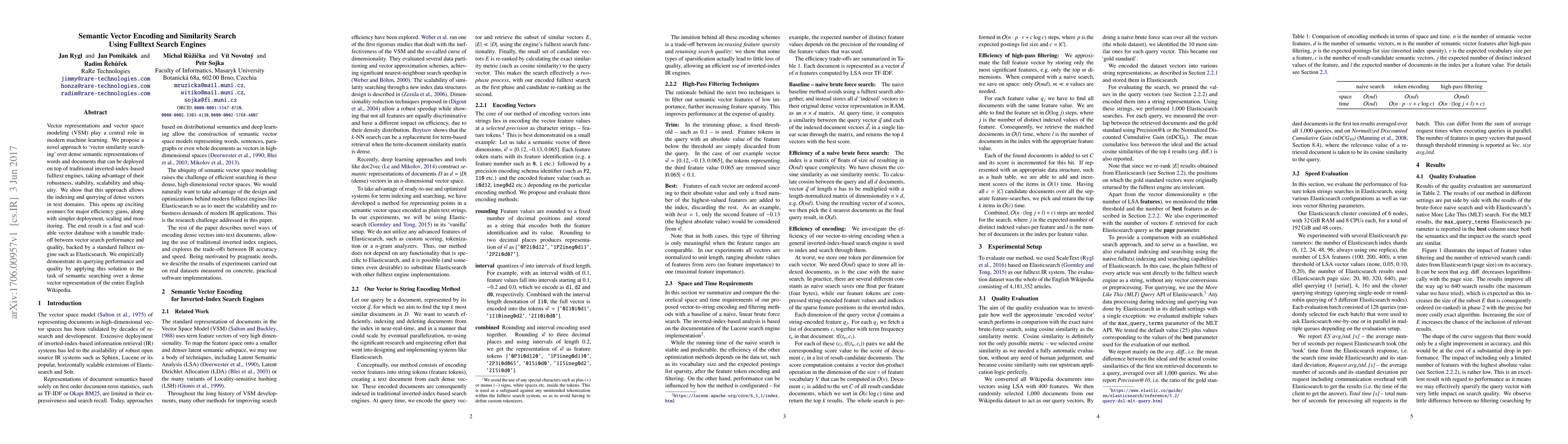 Vector representations and vector space modeling (VSM) play a central role in modern machine learning. We propose a novel approach to `vector similarity searching' over dense semantic representations of words and documents that can be deployed on top of traditional inverted-index-based fulltext engines, taking advantage of their robustness, stability, scalability and ubiquity. We show that this approach allows the indexing and querying of dense vectors in text domains. This opens up exciting avenues for major efficiency gains, along with simpler deployment, scaling and monitoring. The end result is a fast and scalable vector database with a tunable trade-off between vector search performance and quality, backed by a standard fulltext engine such as Elasticsearch. We empirically demonstrate its querying performance and quality by applying this solution to the task of semantic searching over a dense vector representation of the entire English Wikipedia.