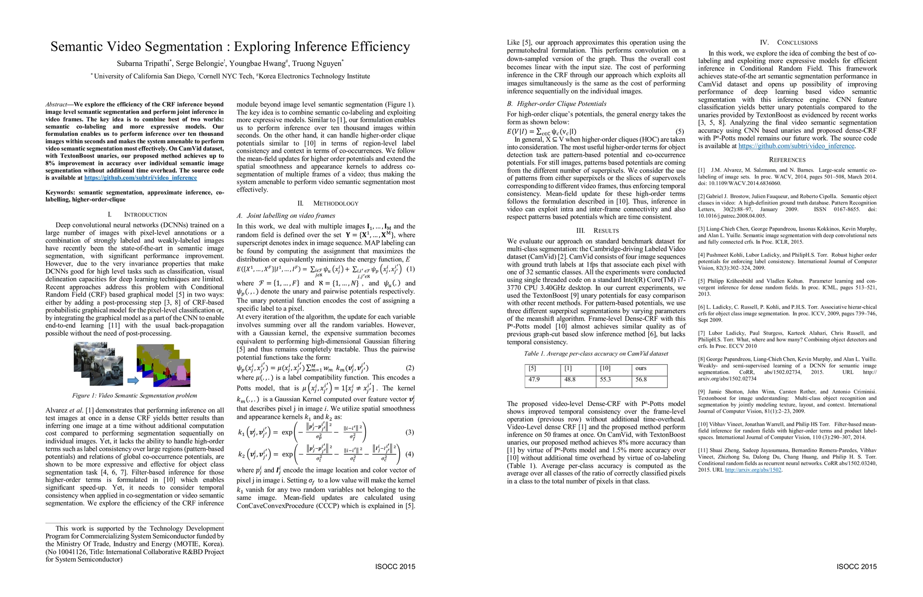 This paper investigates the efficiency of CRF inference for semantic video segmentation, achieving effective joint inference across video frames. The proposed method combines semantic co-labeling and expressive models, enabling rapid processing of thousands of images and improving accuracy by up to 8% on the CamVid dataset without extra time costs.