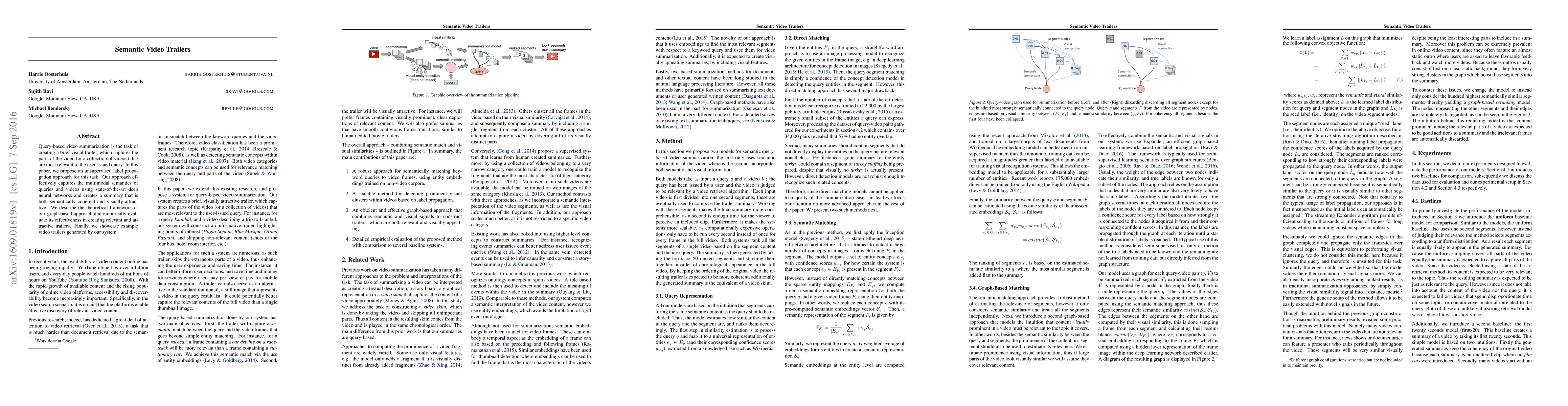 Query-based video summarization is the task of creating a brief visual trailer, which captures the parts of the video (or a collection of videos) that are most relevant to the user-issued query. In this paper, we propose an unsupervised label propagation approach for this task. Our approach effectively captures the multimodal semantics of queries and videos using state-of-the-art deep neural networks and creates a summary that is both semantically coherent and visually attractive. We describe the theoretical framework of our graph-based approach and empirically evaluate its effectiveness in creating relevant and attractive trailers. Finally, we showcase example video trailers generated by our system.