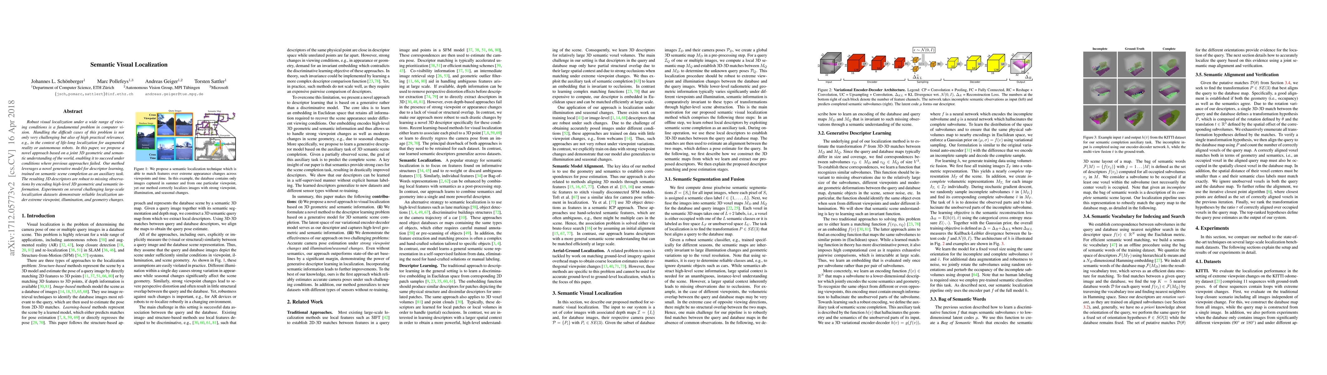 This paper proposes a novel visual localization method that combines 3D geometric and semantic understanding to achieve robust performance under extreme conditions. It utilizes a generative model for descriptor learning, which is trained on semantic scene completion, resulting in descriptors that are resilient to missing observations and changes in viewpoint, illumination, and geometry.
