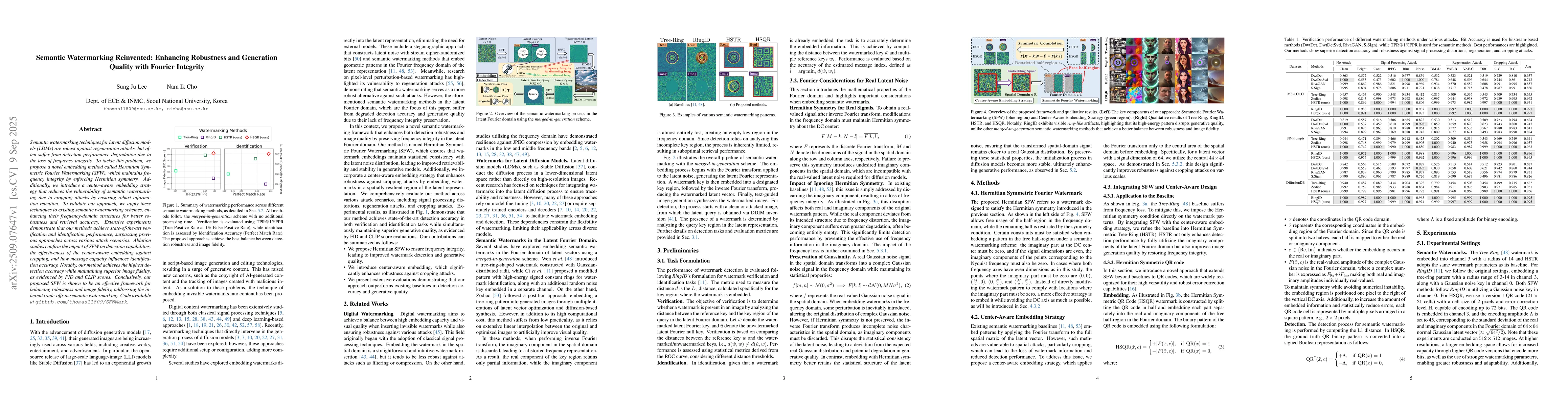 Semantic watermarking techniques for latent diffusion models (LDMs) are robust against regeneration attacks, but often suffer from detection performance degradation due to the loss of frequency integrity. To tackle this problem, we propose a novel embedding method called Hermitian Symmetric Fourier Watermarking (SFW), which maintains frequency integrity by enforcing Hermitian symmetry. Additionally, we introduce a center-aware embedding strategy that reduces the vulnerability of semantic watermarking due to cropping attacks by ensuring robust information retention. To validate our approach, we apply these techniques to existing semantic watermarking schemes, enhancing their frequency-domain structures for better robustness and retrieval accuracy. Extensive experiments demonstrate that our methods achieve state-of-the-art verification and identification performance, surpassing previous approaches across various attack scenarios. Ablation studies confirm the impact of SFW on detection capabilities, the effectiveness of the center-aware embedding against cropping, and how message capacity influences identification accuracy. Notably, our method achieves the highest detection accuracy while maintaining superior image fidelity, as evidenced by FID and CLIP scores. Conclusively, our proposed SFW is shown to be an effective framework for balancing robustness and image fidelity, addressing the inherent trade-offs in semantic watermarking. Code available at https://github.com/thomas11809/SFWMark