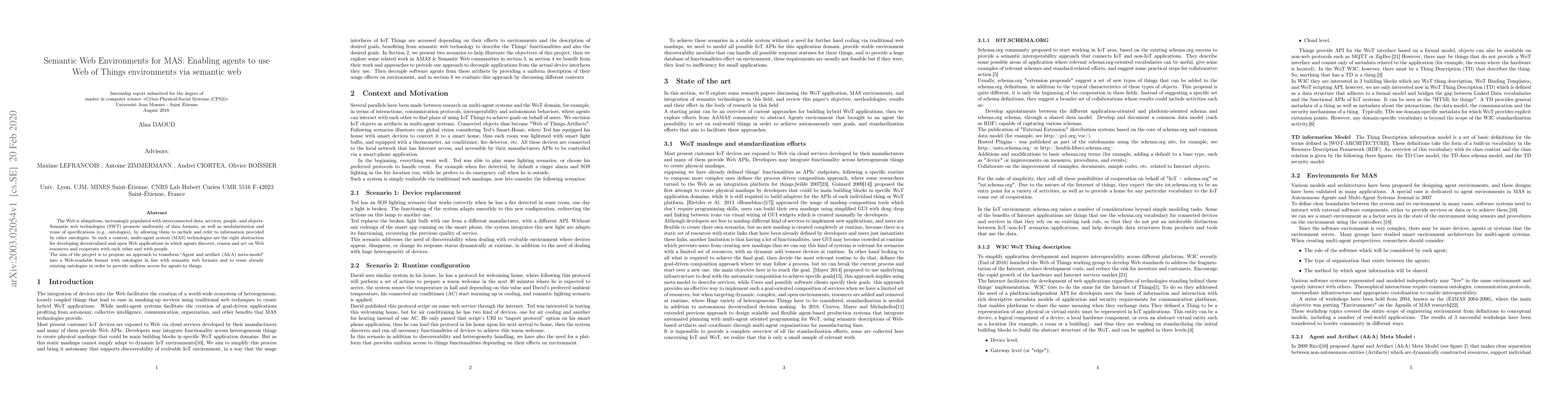 The Web is ubiquitous, increasingly populated with interconnected data, services, people, and objects. Semantic web technologies (SWT) promote uniformity of data formats, as well as modularization and reuse of specifications (e.g., ontologies), by allowing them to include and refer to information provided by other ontologies. In such a context, multi-agent system (MAS) technologies are the right abstraction for developing decentralized and open Web applications in which agents discover, reason and act on Web resources and cooperate with each other and with people. The aim of the project is to propose an approach to transform "Agent and artifact (A&A) meta-model" into a Web-readable format with ontologies in line with semantic web formats and to reuse already existing ontologies in order to provide uniform access for agents to things.