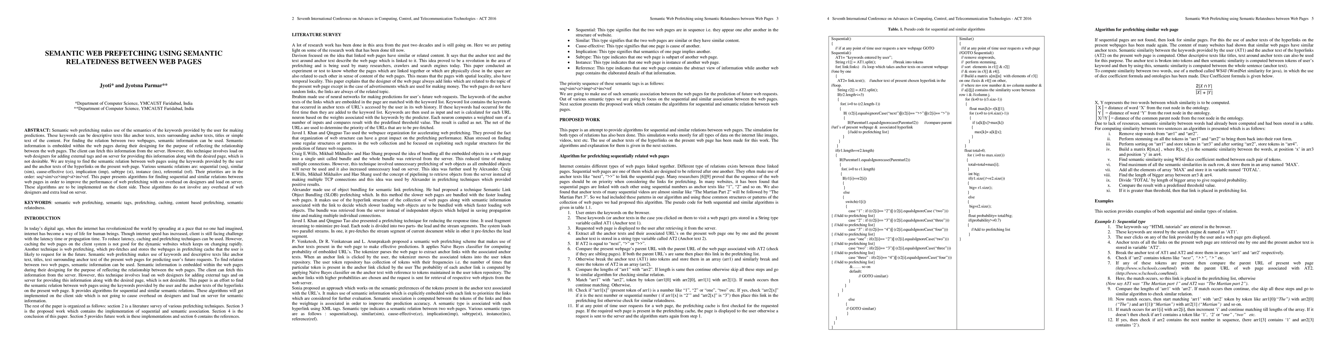 Internet as become the way of life in the fast growing digital life.Even with the increase in the internet speed, higher latency time is still a challenge. To reduce latency, caching and pre fetching techniques can be used. However, caching fails for dynamic websites which keeps on changing rapidly. Another technique is web prefetching, which prefetches the web pages that the user is likely to request for in the future. Semantic web prefetching makes use of keywords and descriptive texts like anchor text, titles, text surrounding anchor text of the present web pages for predicting users future requests. Semantic information is embedded within the web pages during their designing for the purpose of reflecting the relationship between the web pages. The client can fetch this information from the server. However, this technique involves load on web designers for adding external tags and on server for providing this information along with the desired page, which is not desirable. This paper is an effort to find the semantic relation between web pages using the keywords provided by the user and the anchor texts of the hyperlinks on the present web page.It provides algorithms for sequential and similar semantic relations. These algorithms will be implemented on the client side which will not cause overhead on designers and load on server for semantic information.