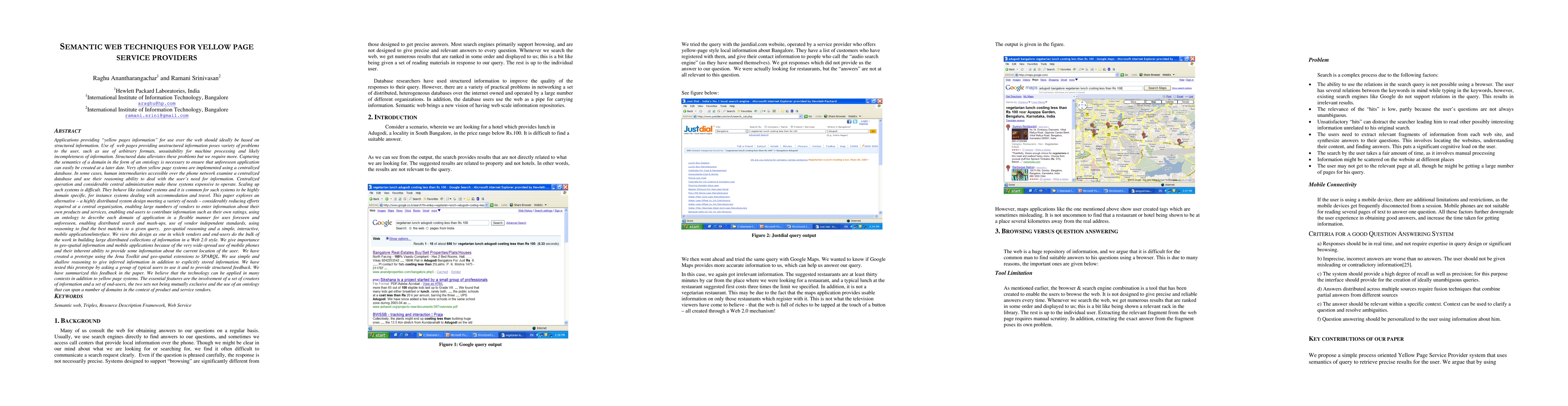 Use of web pages providing unstructured information poses variety of problems to the user, such as use of arbitrary formats, unsuitability for machine processing and likely incompleteness of information. Structured data alleviates these problems but we require more. Very often yellow page systems are implemented using a centralized database. In some cases, human intermediaries accessible over the phone network examine a centralized database and use their reasoning ability to deal with the user's need for information. Scaling up such systems is difficult. This paper explores an alternative - a highly distributed system design meeting a variety of needs - considerably reducing efforts required at a central organization, enabling large numbers of vendors to enter information about their own products and services, enabling end-users to contribute information such as their own ratings, using an ontology to describe each domain of application in a flexible manner for uses foreseen and unforeseen, enabling distributed search and mash-ups, use of vendor independent standards, using reasoning to find the best matches to a given query, geo-spatial reasoning and a simple, interactive, mobile application/interface. We give importance to geo-spatial information and mobile applications because of the very wide-spread use of mobile phones and their inherent ability to provide some information about the current location of the user. We have created a prototype using the Jena Toolkit and geo-spatial extensions to SPARQL. We have tested this prototype by asking a group of typical users to use it and to provide structured feedback. We have summarized this feedback in the paper. We believe that the technology can be applied in many contexts in addition to yellow page systems.