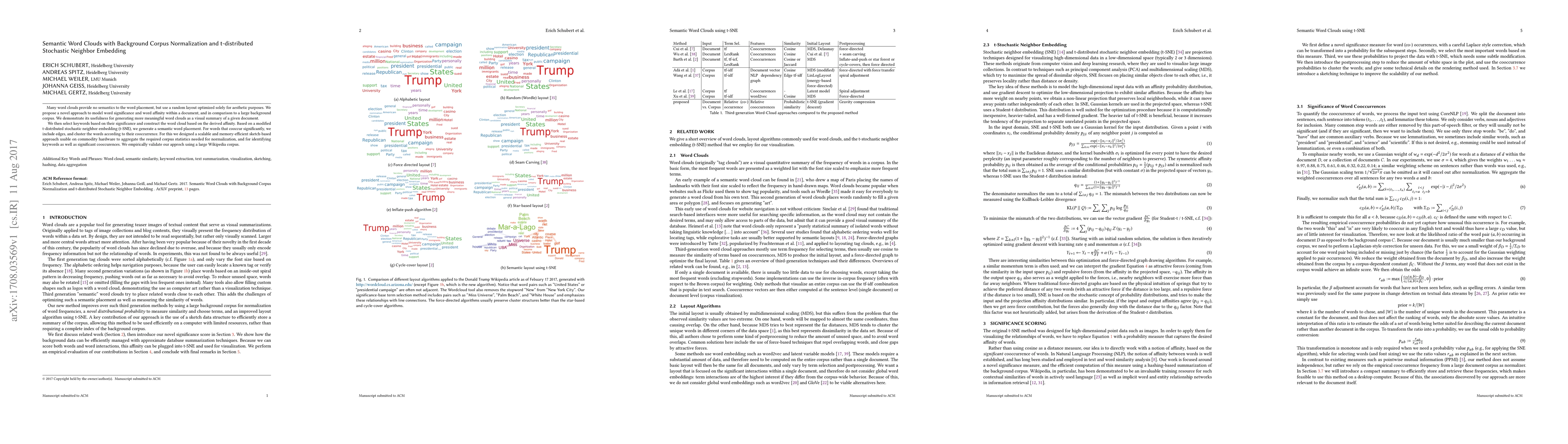 This paper proposes a method for generating semantically meaningful word clouds by normalizing word significance against a background corpus and using a modified t-SNE for word placement. The approach clusters words based on cooccurrence and includes edges for significant cooccurrences, validated using a large Wikipedia corpus.
