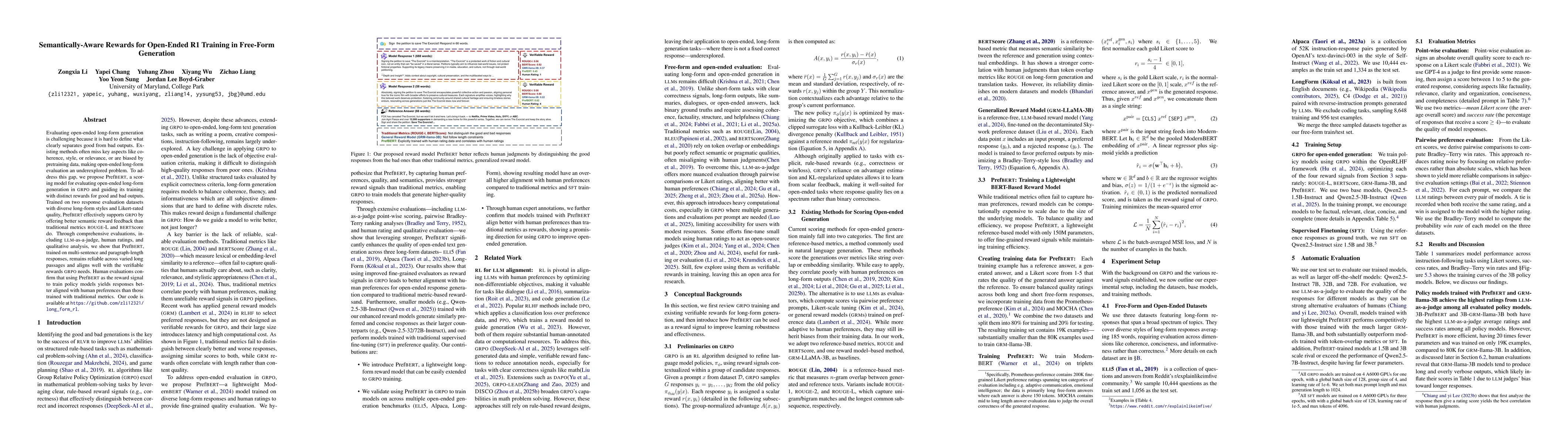 This research introduces PrefBERT, a scoring model designed to evaluate open-ended long-form generation, addressing the challenge of defining good vs bad outputs. PrefBERT, trained on diverse datasets, provides better semantic feedback than ROUGE-L and BERTScore, improving GRPO training with distinct rewards for good and bad outputs. Evaluations confirm its reliability and alignment with human preferences, outperforming traditional metrics.