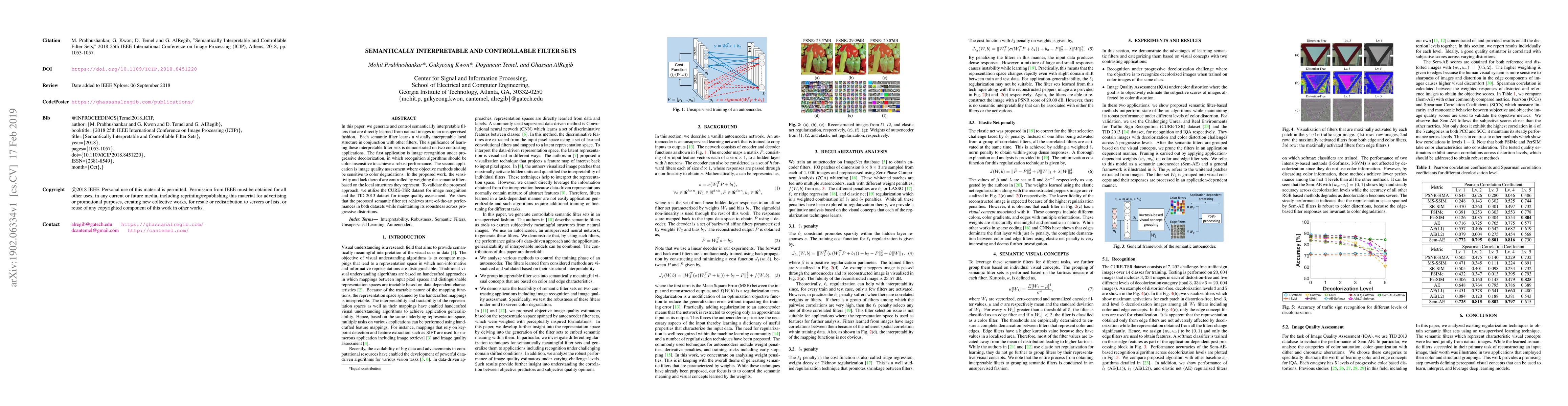 In this paper, we generate and control semantically interpretable filters that are directly learned from natural images in an unsupervised fashion. Each semantic filter learns a visually interpretable local structure in conjunction with other filters. The significance of learning these interpretable filter sets is demonstrated on two contrasting applications. The first application is image recognition under progressive decolorization, in which recognition algorithms should be color-insensitive to achieve a robust performance. The second application is image quality assessment where objective methods should be sensitive to color degradations. In the proposed work, the sensitivity and lack thereof are controlled by weighing the semantic filters based on the local structures they represent. To validate the proposed approach, we utilize the CURE-TSR dataset for image recognition and the TID 2013 dataset for image quality assessment. We show that the proposed semantic filter set achieves state-of-the-art performances in both datasets while maintaining its robustness across progressive distortions.