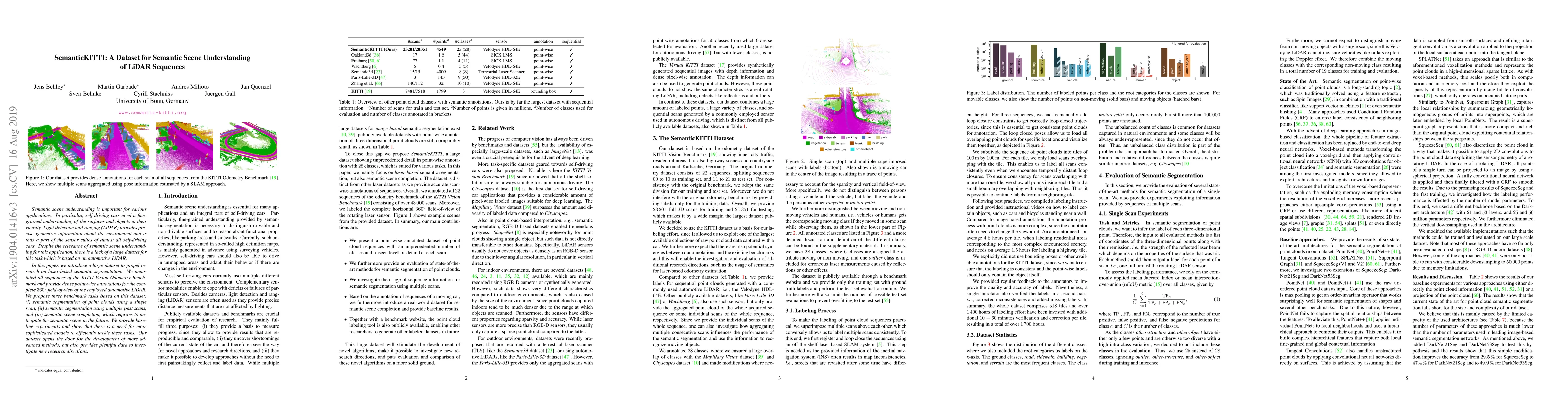 SemanticKITTI is a large dataset for advancing research in LiDAR-based semantic segmentation, providing dense annotations for the KITTI Vision Odometry Benchmark's LiDAR sequences. It supports three benchmark tasks: single-scan, multi-scan semantic segmentation, and future scene completion, highlighting the need for advanced models to address these challenges.
