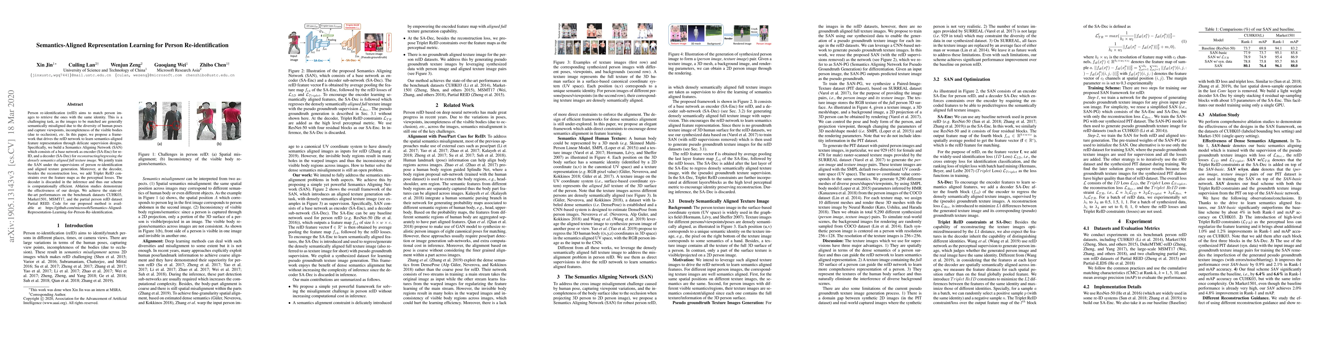 This paper proposes a Semantics Aligning Network (SAN) to enhance person re-identification by learning semantics-aligned feature representations through reconstruction and Triplet ReID constraints. The SAN includes an encoder and a decoder, achieving state-of-the-art results on multiple datasets while maintaining computational efficiency.