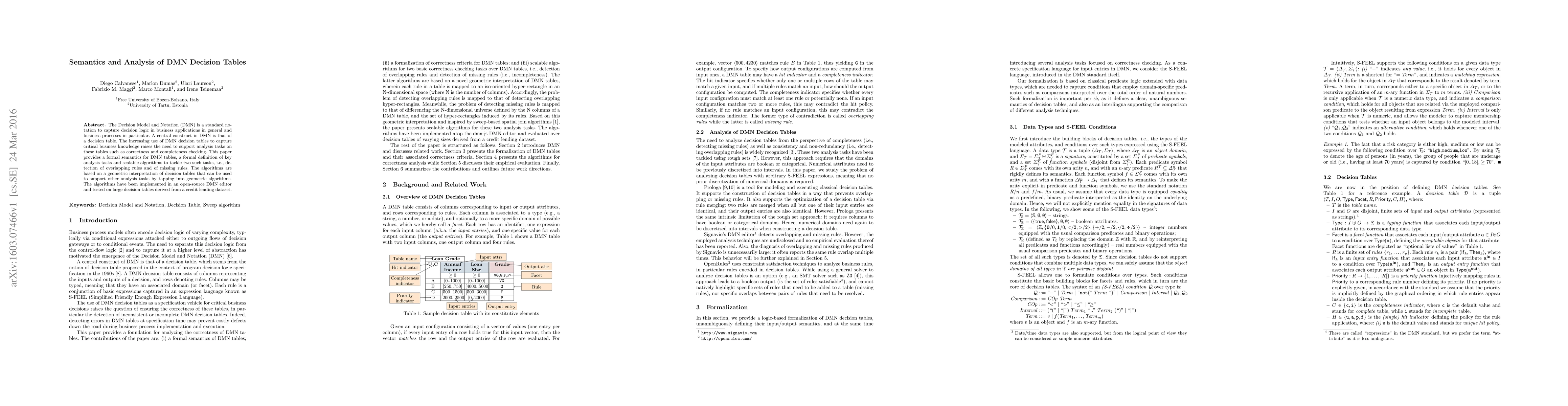The Decision Model and Notation (DMN) is a standard notation to capture decision logic in business applications in general and business processes in particular. A central construct in DMN is that of a decision table. The increasing use of DMN decision tables to capture critical business knowledge raises the need to support analysis tasks on these tables such as correctness and completeness checking. This paper provides a formal semantics for DMN tables, a formal definition of key analysis tasks and scalable algorithms to tackle two such tasks, i.e., detection of overlapping rules and of missing rules. The algorithms are based on a geometric interpretation of decision tables that can be used to support other analysis tasks by tapping into geometric algorithms. The algorithms have been implemented in an open-source DMN editor and tested on large decision tables derived from a credit lending dataset.