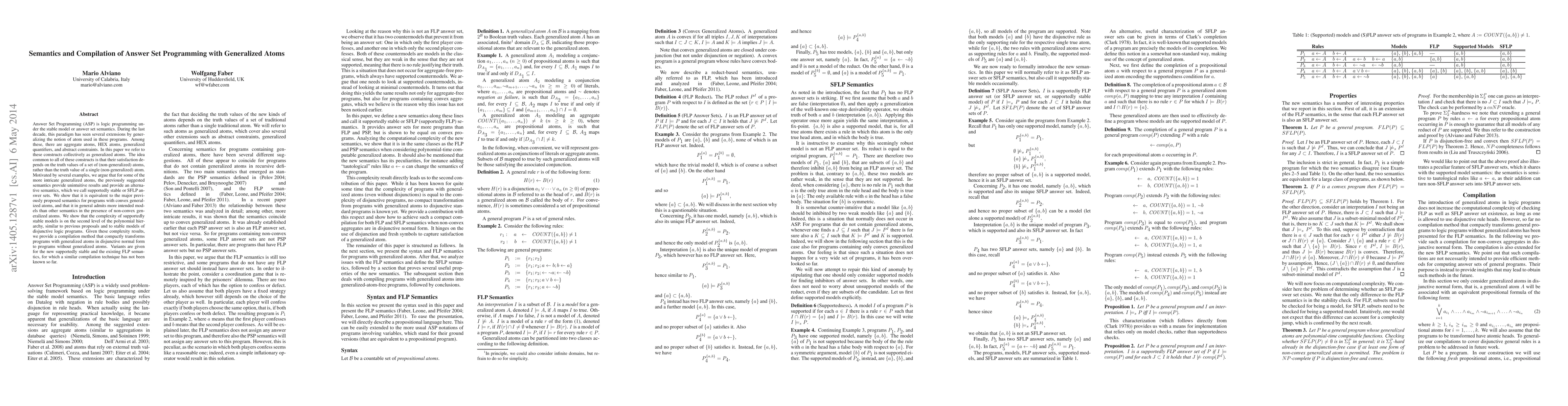 This paper proposes an alternative semantics, called supportedly stable or SFLP answer sets, for Answer Set Programming (ASP) constructs known as generalized atoms, which depend on the truth values of multiple atoms. It demonstrates that this new semantics is equivalent to existing ones for convex generalized atoms and provides more intended models for non-convex cases. It also presents a compilation method to transform programs with generalized atoms into equivalent programs without them.