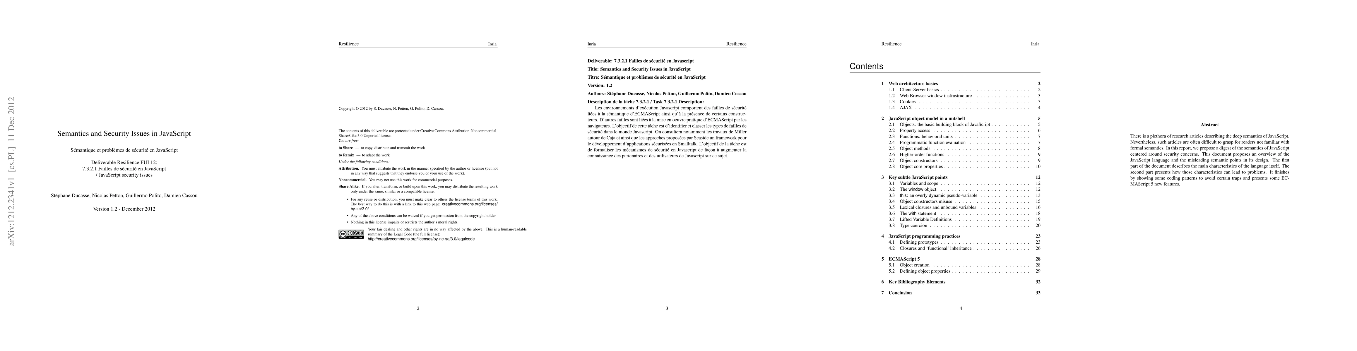 This paper provides a simplified overview of JavaScript's semantics with a focus on security issues, highlighting its characteristics and potential pitfalls, and offers coding patterns to mitigate these risks, along with insights into new ECMAScript 5 features.