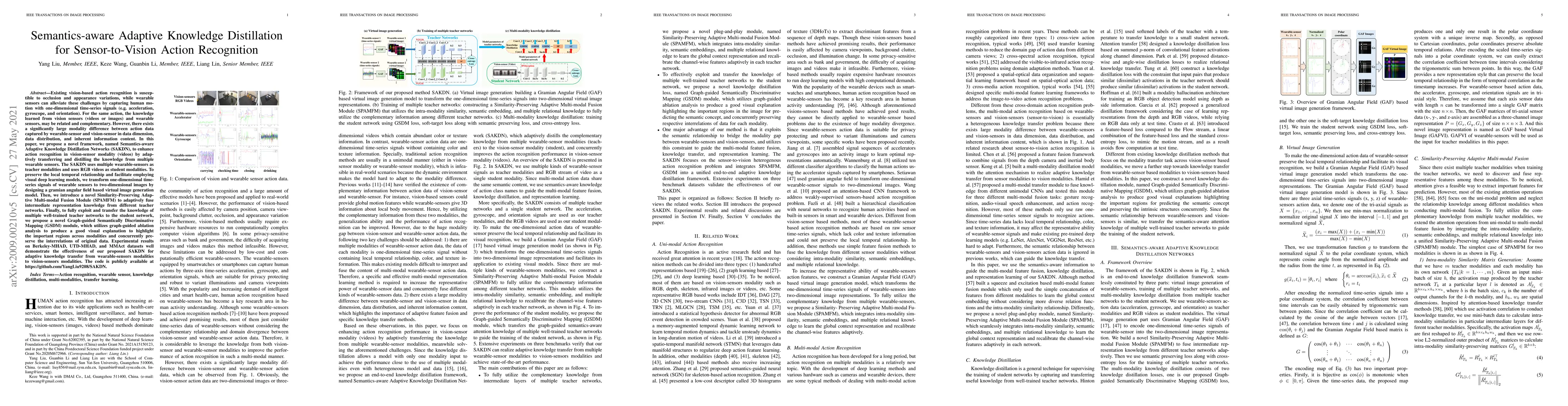 This paper proposes a Semantics-aware Adaptive Knowledge Distillation Networks (SAKDN) framework to enhance vision-based action recognition by distilling knowledge from multiple wearable sensors. The framework transforms sensor data into visual images and employs a Similarity-Preserving Adaptive Multi-modal Fusion Module to fuse knowledge, ultimately improving recognition accuracy on benchmark datasets.