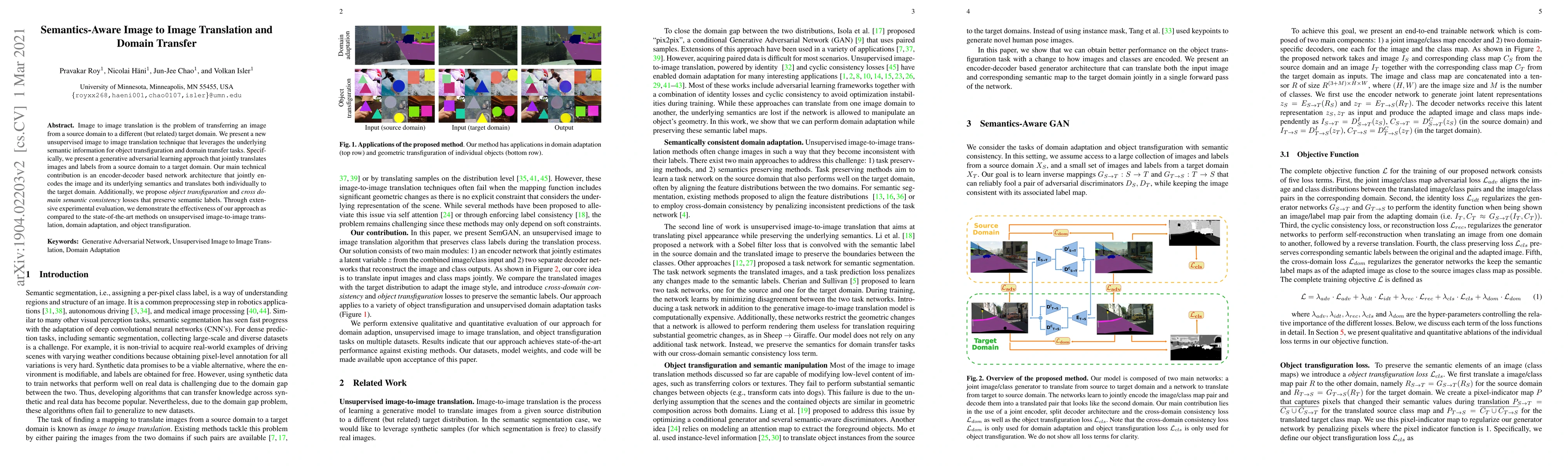This paper introduces an unsupervised image-to-image translation technique that leverages semantic information for domain transfer and object transfiguration. It employs a generative adversarial network with an encoder-decoder architecture to jointly translate images and their semantic labels, enhanced by object transfiguration and cross-domain semantic consistency losses. Experimental results show superior performance over existing methods.
