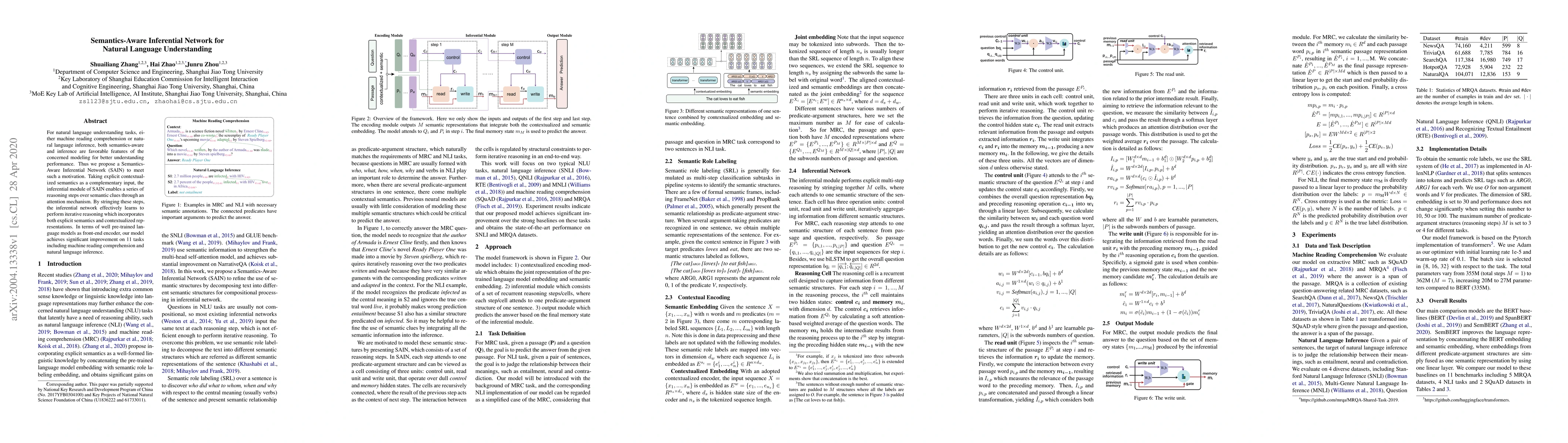 The paper proposes the Semantics-Aware Inferential Network (SAIN) to enhance natural language understanding through explicit semantics and iterative reasoning using an inferential module. SAIN achieves significant improvements on various comprehension and inference tasks by leveraging contextualized semantics and pre-trained language models.