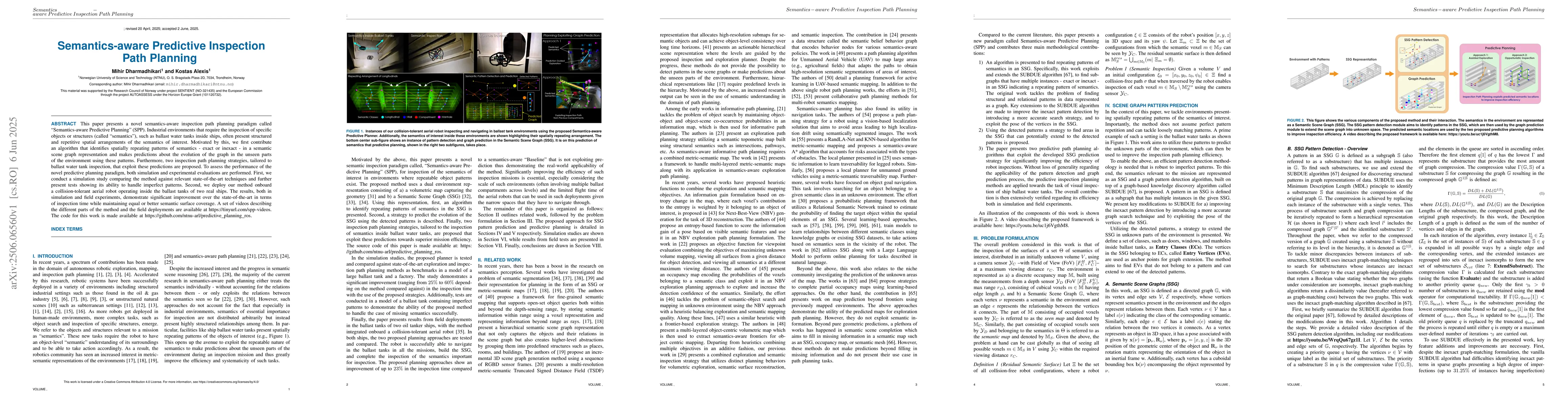 This paper presents a novel semantics-aware inspection path planning paradigm called "Semantics-aware Predictive Planning" (SPP). Industrial environments that require the inspection of specific objects or structures (called "semantics"), such as ballast water tanks inside ships, often present structured and repetitive spatial arrangements of the semantics of interest. Motivated by this, we first contribute an algorithm that identifies spatially repeating patterns of semantics - exact or inexact - in a semantic scene graph representation and makes predictions about the evolution of the graph in the unseen parts of the environment using these patterns. Furthermore, two inspection path planning strategies, tailored to ballast water tank inspection, that exploit these predictions are proposed. To assess the performance of the novel predictive planning paradigm, both simulation and experimental evaluations are performed. First, we conduct a simulation study comparing the method against relevant state-of-the-art techniques and further present tests showing its ability to handle imperfect patterns. Second, we deploy our method onboard a collision-tolerant aerial robot operating inside the ballast tanks of two real ships. The results, both in simulation and field experiments, demonstrate significant improvement over the state-of-the-art in terms of inspection time while maintaining equal or better semantic surface coverage. A set of videos describing the different parts of the method and the field deployments is available at https://tinyurl.com/spp-videos. The code for this work is made available at https://github.com/ntnu-arl/predictive_planning_ros.