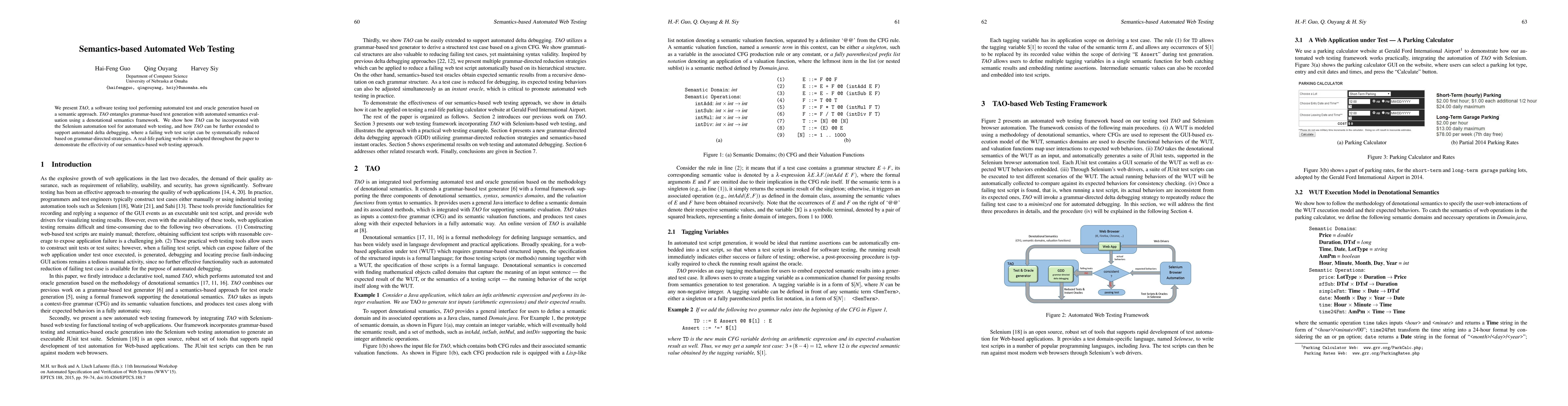 TAO is a novel automated web testing tool that combines grammar-based test generation with denotational semantics for automated oracle generation. It integrates with Selenium and supports delta debugging to refine failing test scripts, demonstrating effectiveness through a real-life parking website.