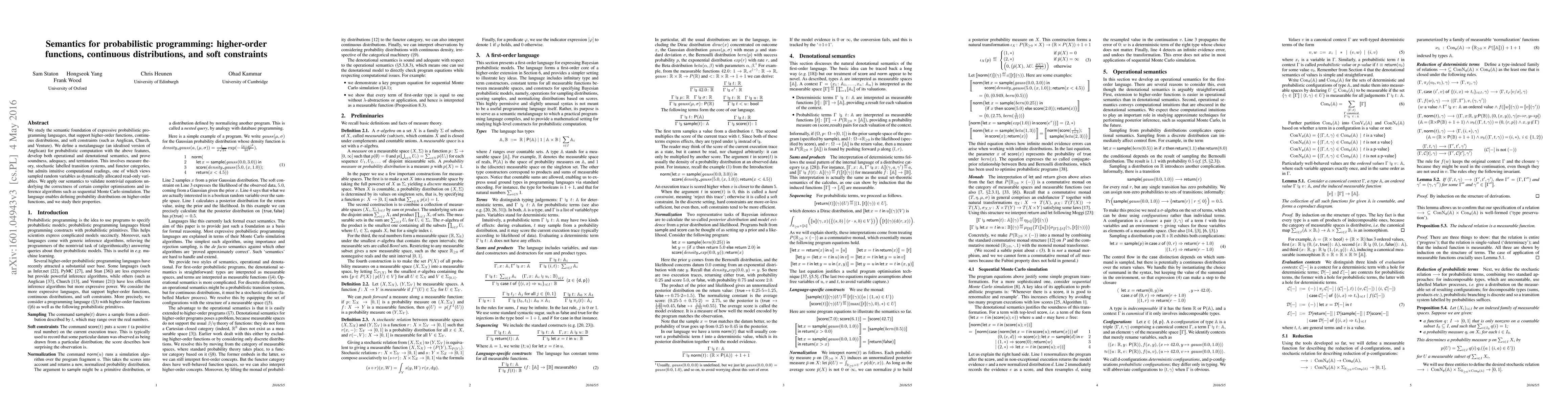 This paper defines a metalanguage for probabilistic programming that supports higher-order functions, continuous distributions, and soft constraints, establishing both operational and denotational semantics. It validates the correctness of compiler optimizations and inference algorithms through soundness, adequacy, and termination proofs.