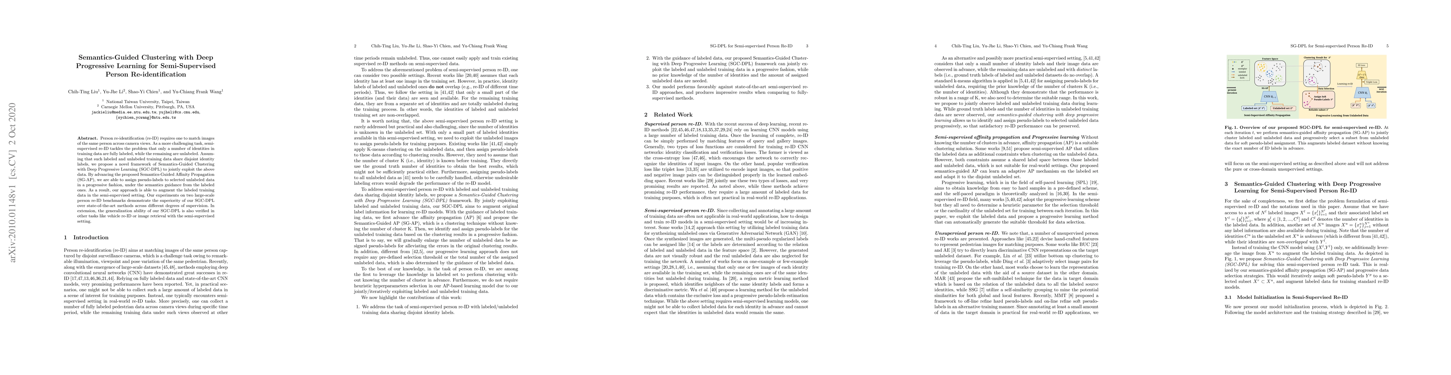 The paper proposes a Semantics-Guided Clustering with Deep Progressive Learning (SGC-DPL) framework for semi-supervised person re-identification, utilizing Semantics-Guided Affinity Propagation to assign pseudo-labels to unlabeled data, thereby augmenting labeled training data and outperforming state-of-the-art methods. The approach also generalizes to vehicle re-ID and image retrieval tasks.