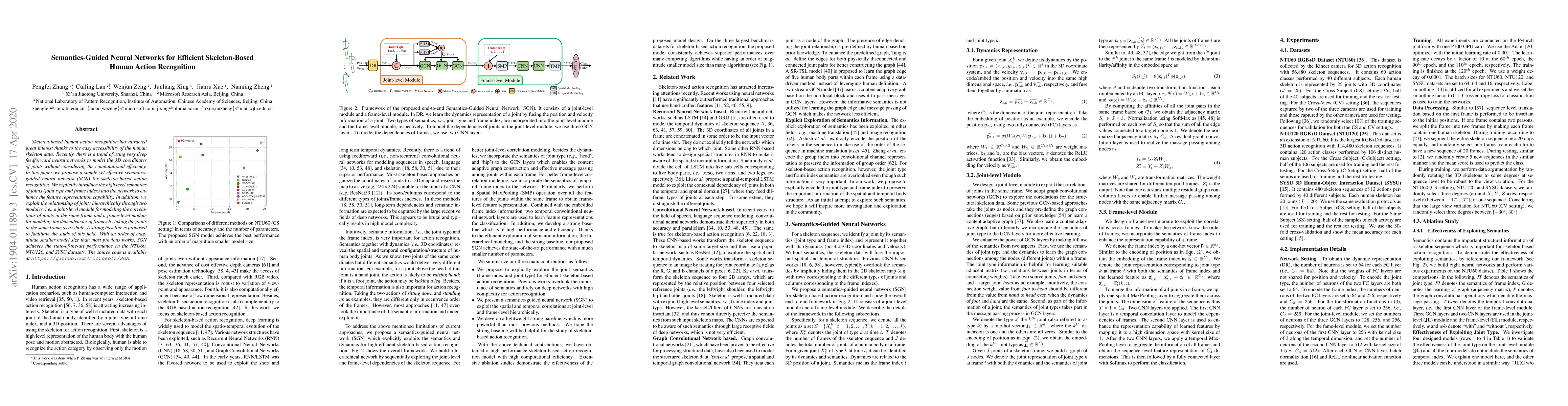 This paper proposes a semantics-guided neural network (SGN) for efficient skeleton-based human action recognition, incorporating joint semantics and hierarchical relationships to enhance feature representation. SGN achieves state-of-the-art performance with significantly smaller model size compared to previous methods.