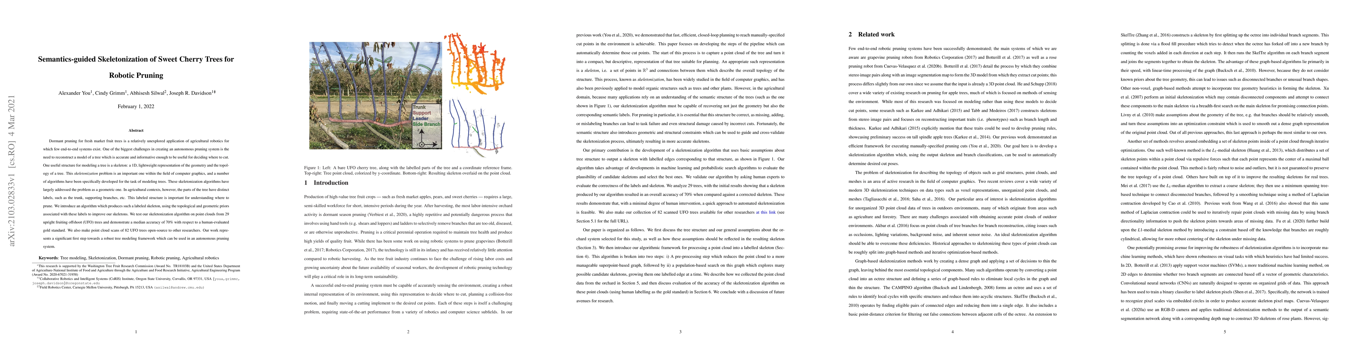 This paper presents a semantics-guided algorithm for skeletonizing sweet cherry trees to aid in robotic pruning, focusing on creating a labeled skeleton that reflects the tree's geometry and topology for effective pruning decisions. The algorithm achieves a median accuracy of 70% compared to human evaluations, and the authors release point cloud data for further research.