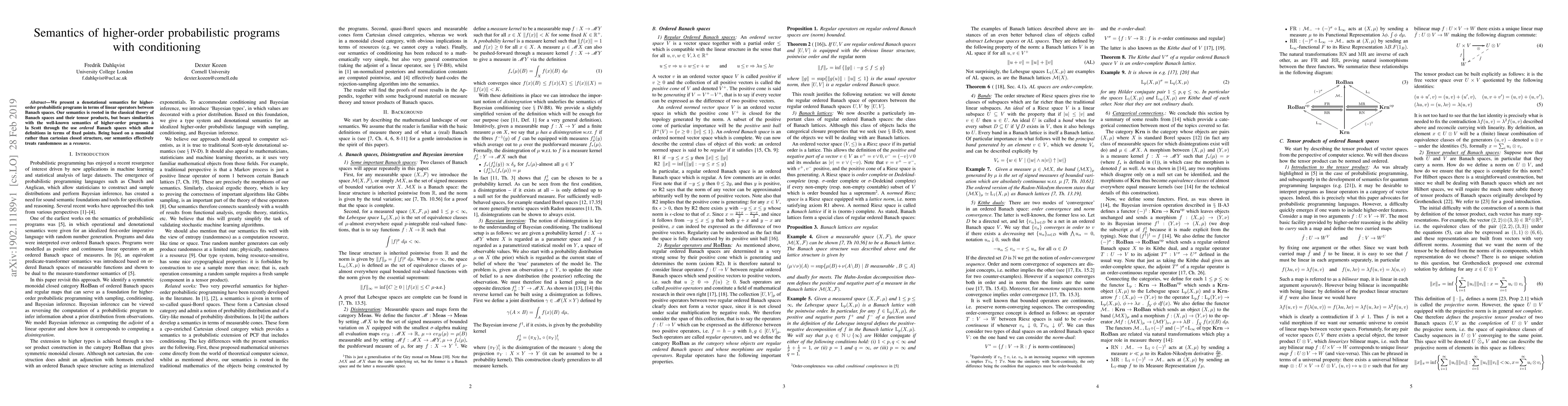 This paper introduces a denotational semantics for higher-order probabilistic programs using linear operators on Banach spaces, treating randomness as a resource, and draws parallels to Scott semantics through ordered Banach spaces and fixed points.