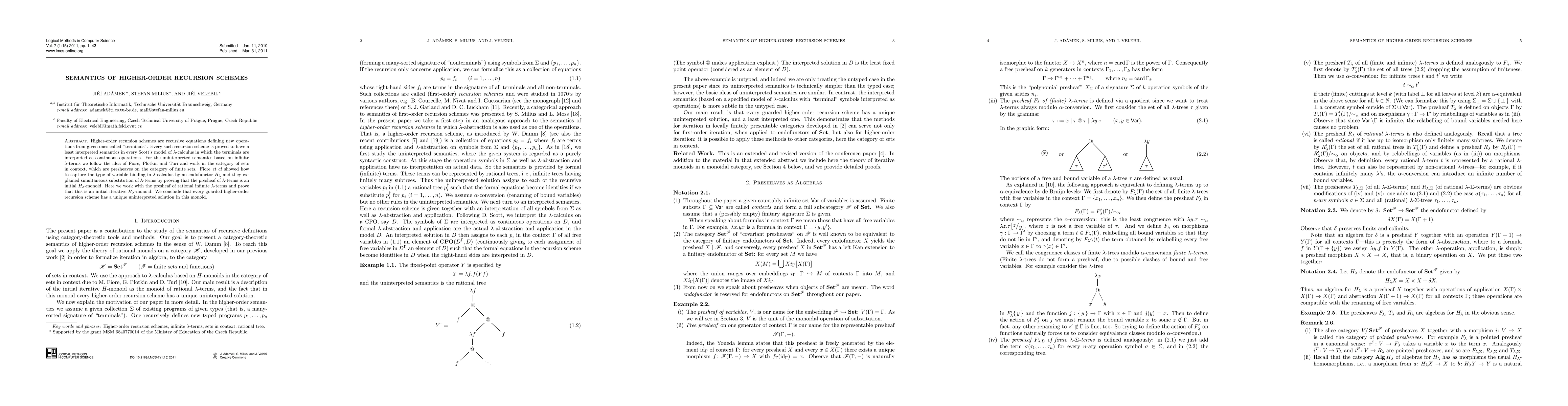 Higher-order recursion schemes are recursive equations defining new operations from given ones called "terminals". Every such recursion scheme is proved to have a least interpreted semantics in every Scott's model of \lambda-calculus in which the terminals are interpreted as continuous operations. For the uninterpreted semantics based on infinite \lambda-terms we follow the idea of Fiore, Plotkin and Turi and work in the category of sets in context, which are presheaves on the category of finite sets. Fiore et al showed how to capture the type of variable binding in \lambda-calculus by an endofunctor H\lambda and they explained simultaneous substitution of \lambda-terms by proving that the presheaf of \lambda-terms is an initial H\lambda-monoid. Here we work with the presheaf of rational infinite \lambda-terms and prove that this is an initial iterative H\lambda-monoid. We conclude that every guarded higher-order recursion scheme has a unique uninterpreted solution in this monoid.