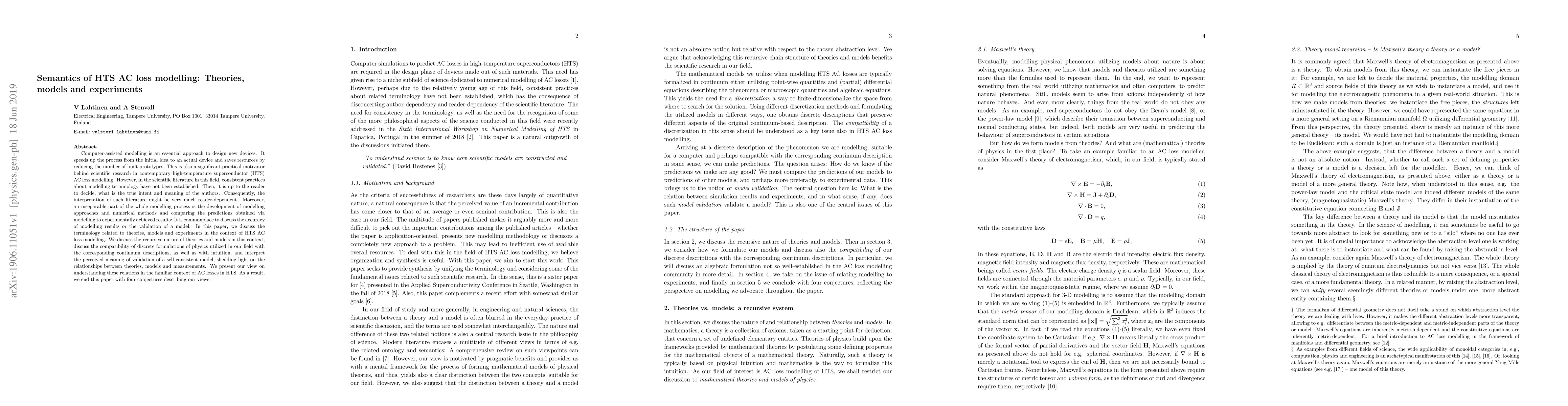Computer-assisted modelling is an essential approach to design new devices. It speeds up the process from the initial idea to an actual device and saves resources by reducing the number of built prototypes. This is also a significant practical motivator behind scientific research in contemporary high-temperature superconductor (HTS) AC loss modelling. However, in the scientific literature in this field, consistent practices about modelling terminology have not been established. Then, it is up to the reader to decide, what is the true intent and meaning of the authors. Consequently, the interpretation of such literature might be very much reader-dependent. Moreover, an inseparable part of the whole modelling process is the development of modelling approaches and numerical methods and comparing the predictions obtained via modelling to experimentally achieved results: It is commonplace to discuss the accuracy of modelling results or the validation of a model. In this paper, we discuss the terminology related to theories, models and experiments in the context of HTS AC loss modelling. We discuss the recursive nature of theories and models in this context, discuss the compatibility of discrete formulations of physics utilized in our field with the corresponding continuum descriptions, as well as with intuition, and interpret the perceived meaning of validation of a self-consistent model, shedding light on the relationships between theories, models and measurements. We present our view on understanding these relations in the familiar context of AC losses in HTS. As a result, we end this paper with four conjectures describing our views.