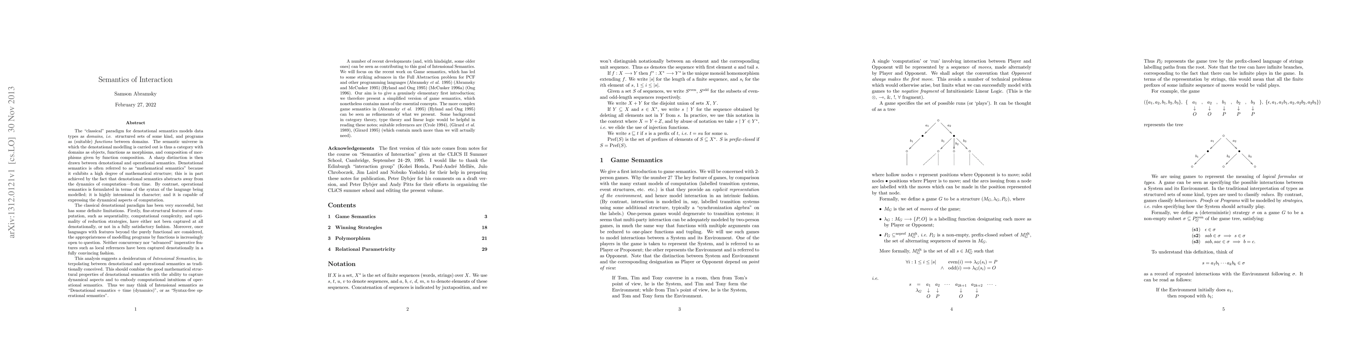 This is an introduction to Game Semantics based on some lecture notes given at the CLiCS II summer school in Cambridge in 1995. We will focus on the recent (1994) work on Game semantics, which has led to some striking advances in the Full Abstraction problem for PCF and other programming languages. Our aim is to give a genuinely elementary first introduction; we therefore present a simplified version of game semantics, which nonetheless contains most of the essential concepts. The more complex game semantics used by Abramsky, Jagadeesan and Malacaria and by Hyland and Ong to construct fully abstract models for PCF can be seen as refinements of what we present. Some background in category theory, type theory and linear logic would be helpful in reading these notes.
