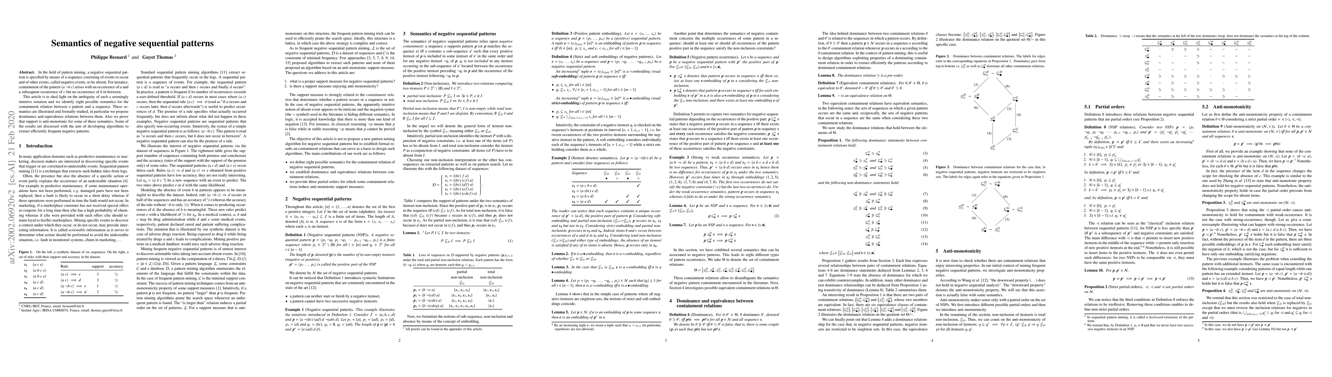 The paper investigates the semantics of negative sequential patterns, identifying eight possible containment semantics and proposing dominance and equivalence relations between them. It also proves anti-monotonicity for certain semantics in the context of pattern mining.