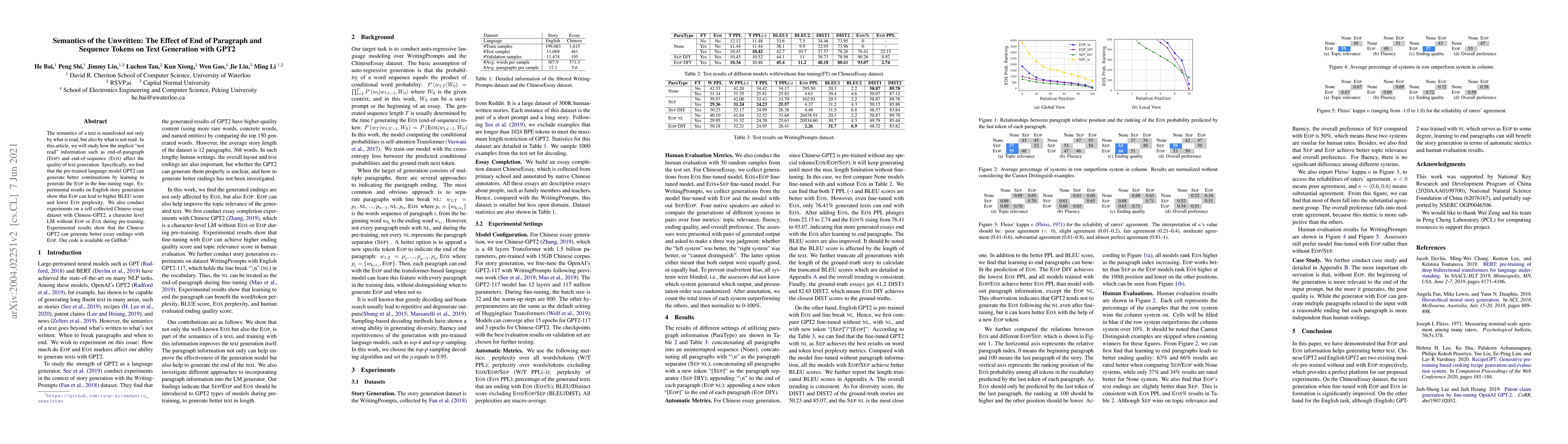 The semantics of a text is manifested not only by what is read, but also by what is not read. In this article, we will study how the implicit "not read" information such as end-of-paragraph (\eop) and end-of-sequence (\eos) affect the quality of text generation. Specifically, we find that the pre-trained language model GPT2 can generate better continuations by learning to generate the \eop in the fine-tuning stage. Experimental results on English story generation show that \eop can lead to higher BLEU score and lower \eos perplexity. We also conduct experiments on a self-collected Chinese essay dataset with Chinese-GPT2, a character level LM without \eop or \eos during pre-training. Experimental results show that the Chinese GPT2 can generate better essay endings with \eop.