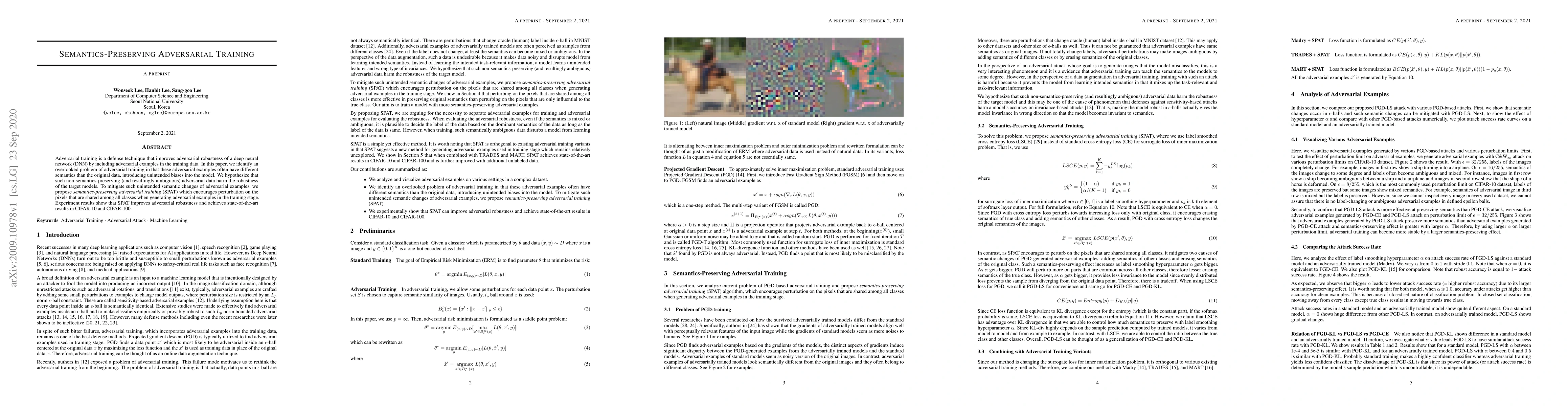 This paper proposes semantics-preserving adversarial training (SPAT) to mitigate unintended semantic changes in adversarial examples, which often have different meanings than original data. SPAT focuses perturbations on pixels shared among all classes, enhancing adversarial robustness and achieving top results on CIFAR-10 and CIFAR-100.