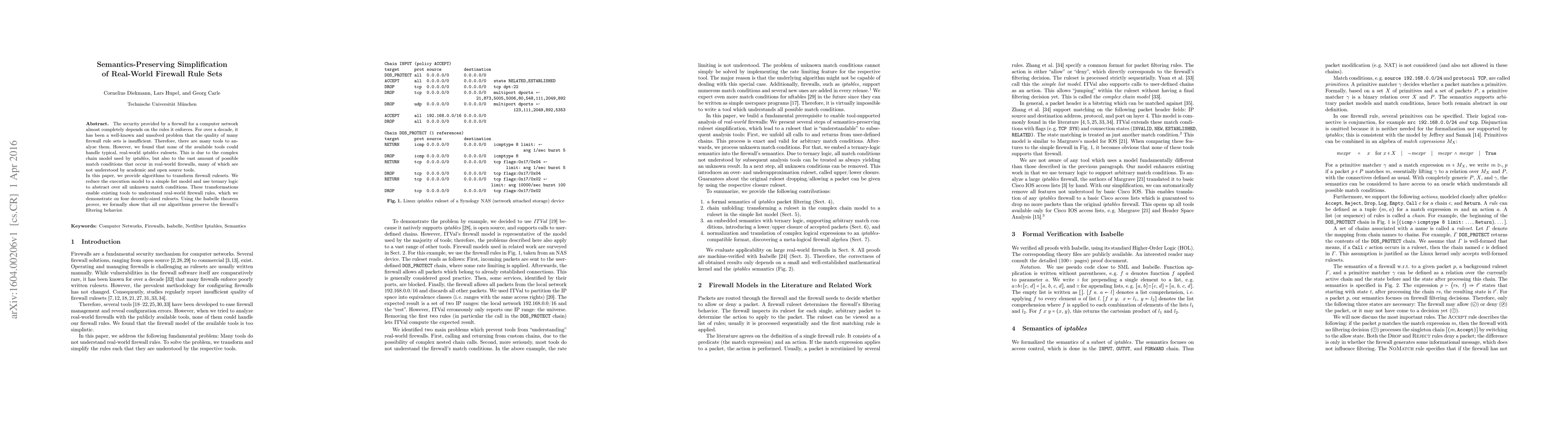 This paper presents algorithms to simplify complex real-world firewall rulesets, transforming them into a simple list model while preserving semantics using ternary logic. The authors demonstrate that these transformations enable existing tools to interpret the rules and formally prove the algorithms' correctness using the Isabelle theorem prover.