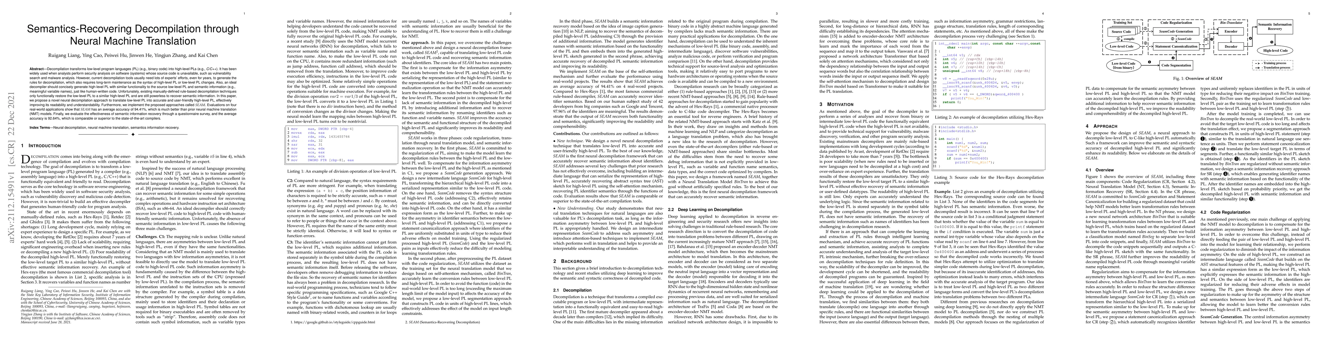 This paper proposes a neural decompilation approach using neural machine translation to transform low-level program languages into high-level PLs with improved readability and semantic information recovery. The implemented SEAM model achieves an average decompilation accuracy of 94.41% and semantic recovery accuracy of 92.64%, outperforming prior NMT models and state-of-the-art compilers.