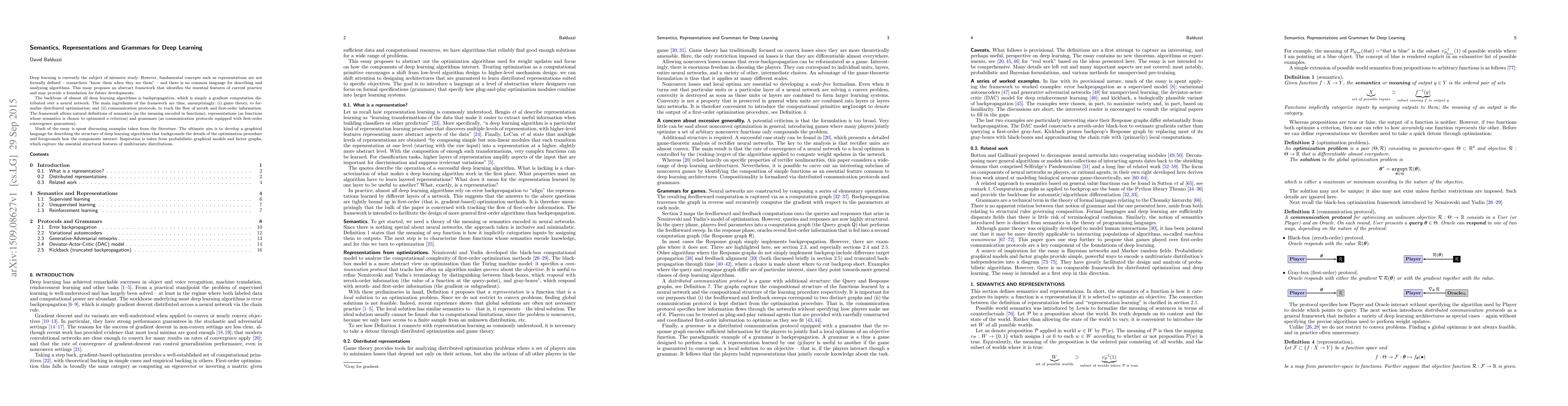 Deep learning is currently the subject of intensive study. However, fundamental concepts such as representations are not formally defined -- researchers "know them when they see them" -- and there is no common language for describing and analyzing algorithms. This essay proposes an abstract framework that identifies the essential features of current practice and may provide a foundation for future developments. The backbone of almost all deep learning algorithms is backpropagation, which is simply a gradient computation distributed over a neural network. The main ingredients of the framework are thus, unsurprisingly: (i) game theory, to formalize distributed optimization; and (ii) communication protocols, to track the flow of zeroth and first-order information. The framework allows natural definitions of semantics (as the meaning encoded in functions), representations (as functions whose semantics is chosen to optimized a criterion) and grammars (as communication protocols equipped with first-order convergence guarantees). Much of the essay is spent discussing examples taken from the literature. The ultimate aim is to develop a graphical language for describing the structure of deep learning algorithms that backgrounds the details of the optimization procedure and foregrounds how the components interact. Inspiration is taken from probabilistic graphical models and factor graphs, which capture the essential structural features of multivariate distributions.