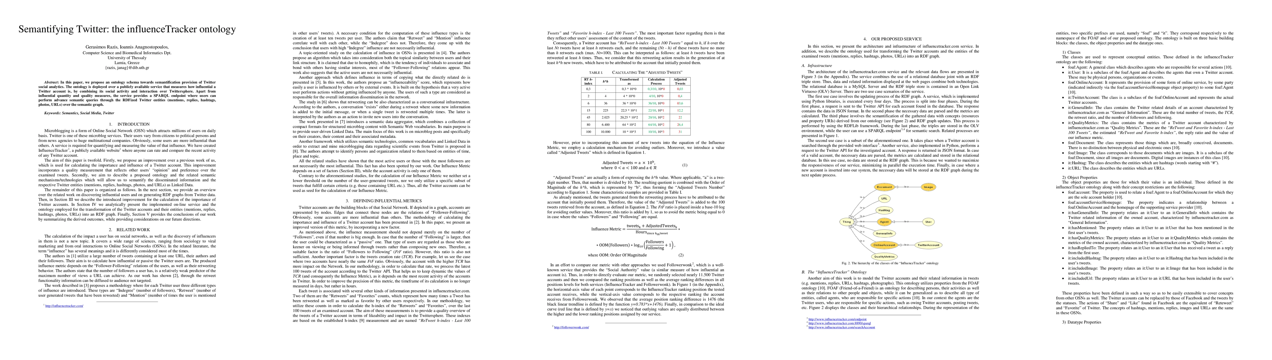 In this paper, we propose an ontology schema towards semantification provision of Twitter social analytics. The ontology is deployed over a publicly available service that measures how influential a Twitter account is, by combining its social activity and interaction over Twittersphere. Apart from influential quantity and quality measures, the service provides a SPARQL endpoint where users can perform advance semantic queries through the RDFized Twitter entities (mentions, replies, hashtags, photos, URLs) over the semantic graph.