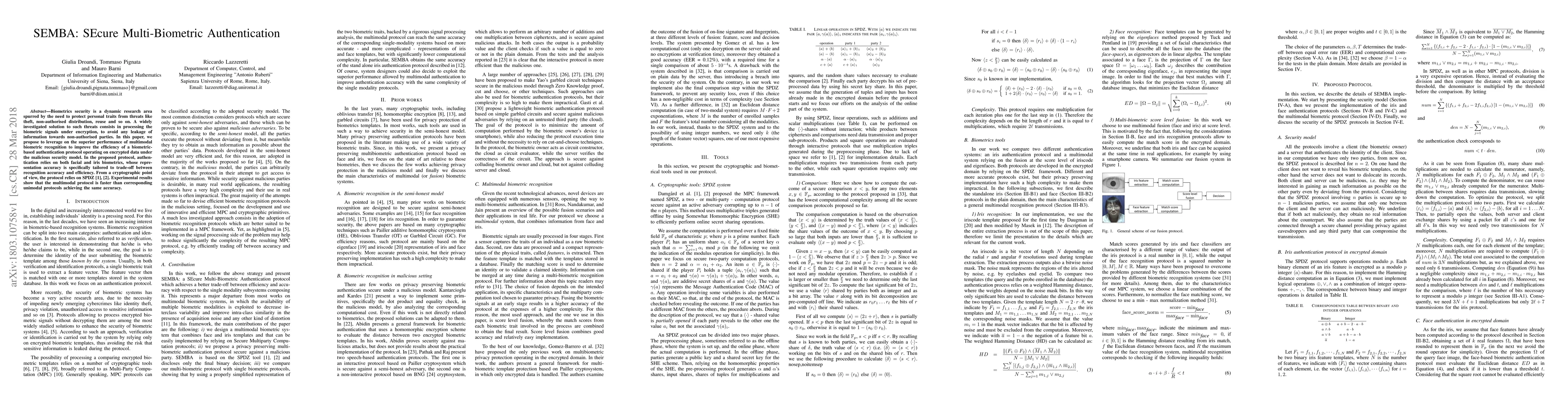 The paper proposes SEMBA, a secure multi-biometric authentication protocol leveraging facial and iris biometrics for enhanced efficiency under encryption. Utilizing the SPDZ multi-party computation tool, the multimodal approach achieves faster authentication with comparable accuracy to unimodal protocols.