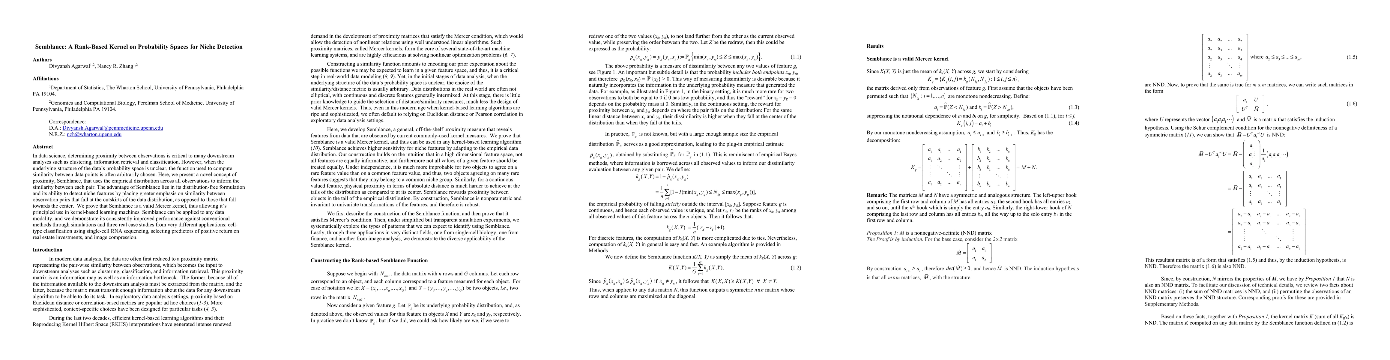 This research introduces Semblance, a novel rank-based kernel measuring similarity in data's probability space, focusing on outlier pairs rather than central ones. It's proven to be a valid Mercer kernel, outperforming traditional methods in diverse applications including cell classification, real estate investment prediction, and image compression.