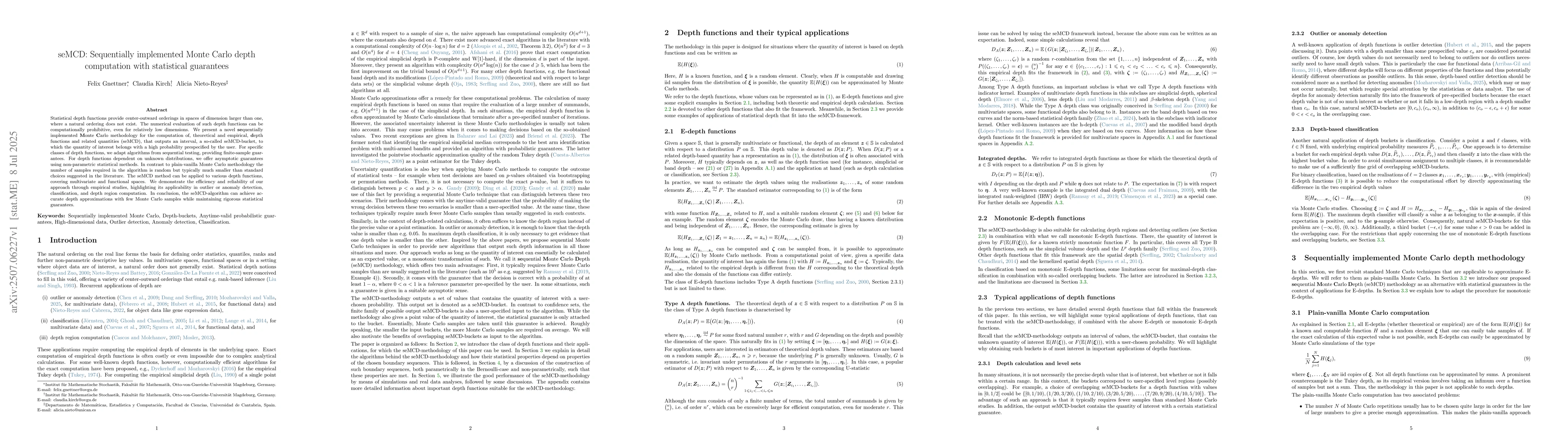 Statistical depth functions provide center-outward orderings in spaces of dimension larger than one, where a natural ordering does not exist. The numerical evaluation of such depth functions can be computationally prohibitive, even for relatively low dimensions. We present a novel sequentially implemented Monte Carlo methodology for the computation of, theoretical and empirical, depth functions and related quantities (seMCD), that outputs an interval, a so-called seMCD-bucket, to which the quantity of interest belongs with a high probability prespecified by the user. For specific classes of depth functions, we adapt algorithms from sequential testing, providing finite-sample guarantees. For depth functions dependent on unknown distributions, we offer asymptotic guarantees using non-parametric statistical methods. In contrast to plain-vanilla Monte Carlo methodology the number of samples required in the algorithm is random but typically much smaller than standard choices suggested in the literature. The seMCD method can be applied to various depth functions, covering multivariate and functional spaces. We demonstrate the efficiency and reliability of our approach through empirical studies, highlighting its applicability in outlier or anomaly detection, classification, and depth region computation. In conclusion, the seMCD-algorithm can achieve accurate depth approximations with few Monte Carlo samples while maintaining rigorous statistical guarantees.