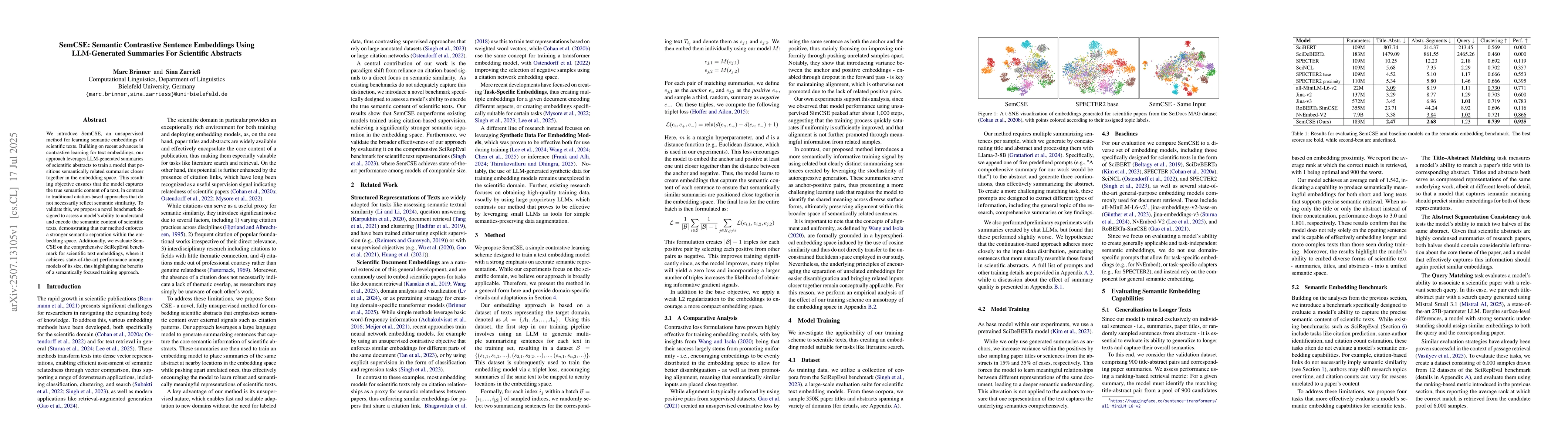We introduce SemCSE, an unsupervised method for learning semantic embeddings of scientific texts. Building on recent advances in contrastive learning for text embeddings, our approach leverages LLM-generated summaries of scientific abstracts to train a model that positions semantically related summaries closer together in the embedding space. This resulting objective ensures that the model captures the true semantic content of a text, in contrast to traditional citation-based approaches that do not necessarily reflect semantic similarity. To validate this, we propose a novel benchmark designed to assess a model's ability to understand and encode the semantic content of scientific texts, demonstrating that our method enforces a stronger semantic separation within the embedding space. Additionally, we evaluate SemCSE on the comprehensive SciRepEval benchmark for scientific text embeddings, where it achieves state-of-the-art performance among models of its size, thus highlighting the benefits of a semantically focused training approach.
