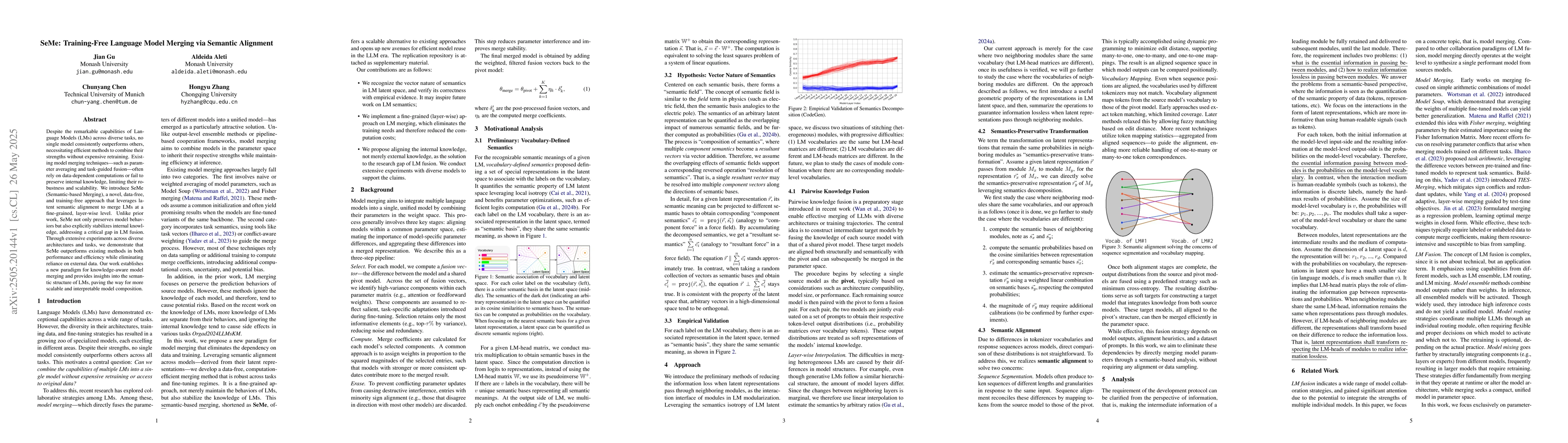 SeMe merges Language Models without retraining, using latent semantic alignment to preserve internal knowledge and stabilize model behavior. It outperforms existing methods in performance and efficiency, providing a new paradigm for knowledge-aware model merging.