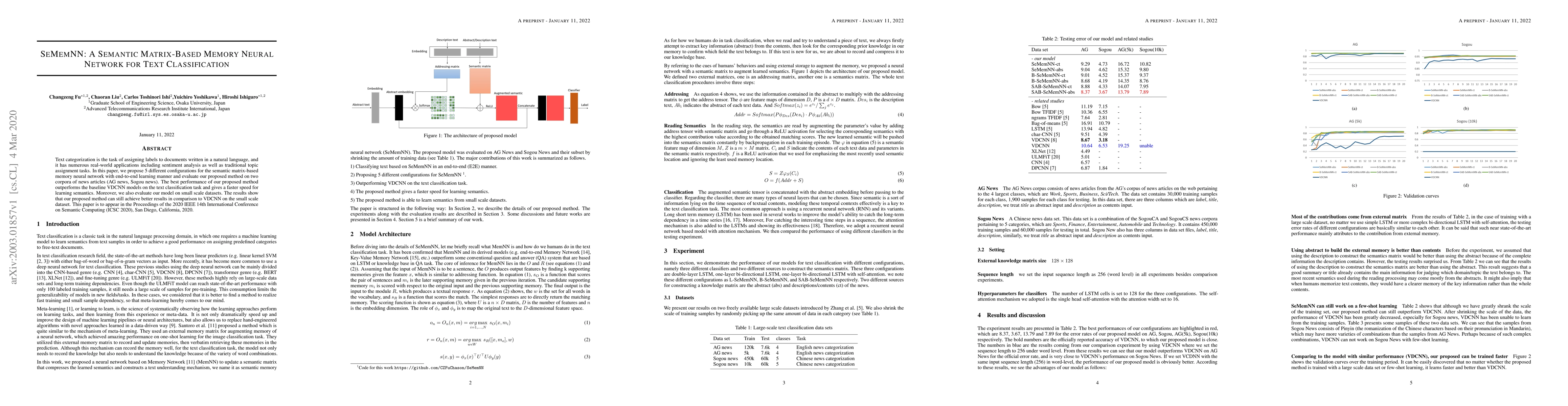 The paper introduces SeMemNN, a semantic matrix-based memory neural network for text classification. It outperforms baseline VDCNN models on AG news and Sogou news corpora, demonstrating faster learning of semantics. SeMemNN also excels on small-scale datasets, showcasing its versatility and efficiency in text categorization tasks.
