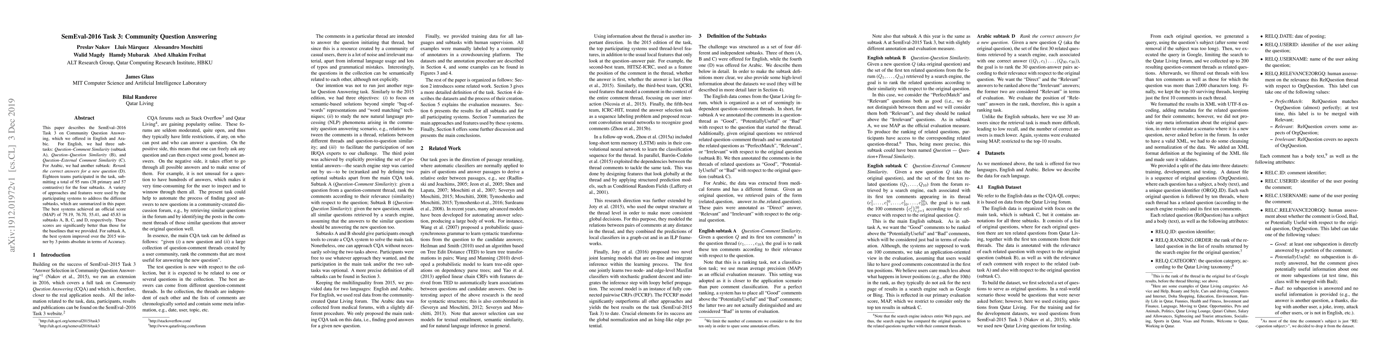 This paper describes the SemEval--2016 Task 3 on Community Question Answering, which we offered in English and Arabic. For English, we had three subtasks: Question--Comment Similarity (subtask A), Question--Question Similarity (B), and Question--External Comment Similarity (C). For Arabic, we had another subtask: Rerank the correct answers for a new question (D). Eighteen teams participated in the task, submitting a total of 95 runs (38 primary and 57 contrastive) for the four subtasks. A variety of approaches and features were used by the participating systems to address the different subtasks, which are summarized in this paper. The best systems achieved an official score (MAP) of 79.19, 76.70, 55.41, and 45.83 in subtasks A, B, C, and D, respectively. These scores are significantly better than those for the baselines that we provided. For subtask A, the best system improved over the 2015 winner by 3 points absolute in terms of Accuracy.