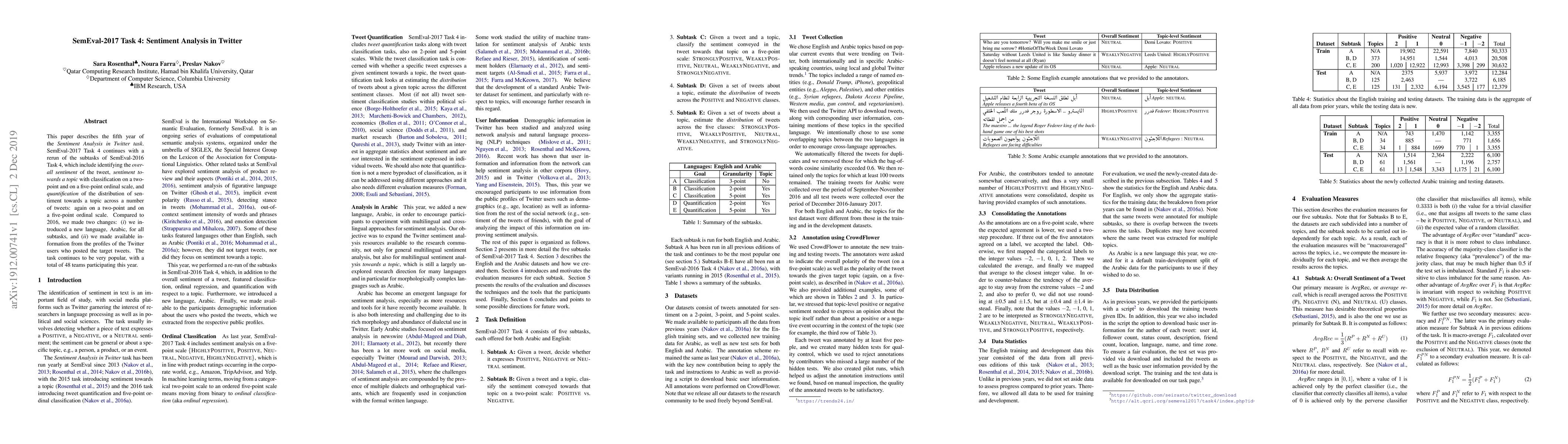 The paper describes SemEval-2017 Task 4, which focuses on sentiment analysis in Twitter, including identifying overall sentiment, sentiment towards a topic on two-point and five-point ordinal scales, and quantifying sentiment distribution across tweets for topics. The task introduced Arabic language support and user profile information, attracting 48 teams.