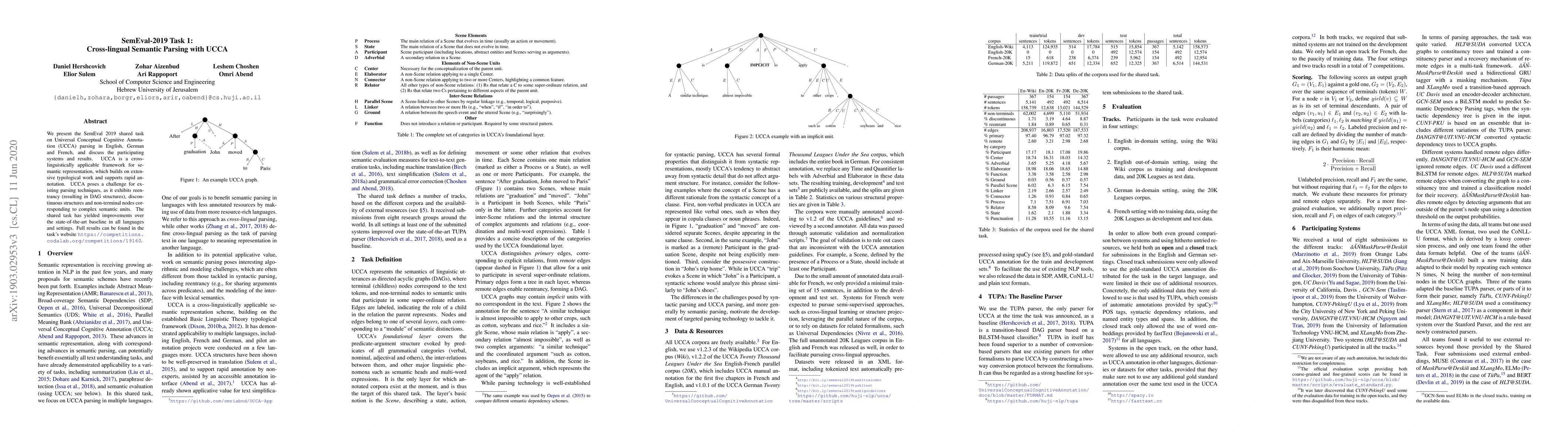 The SemEval 2019 Task 1 explored cross-lingual semantic parsing using UCCA, achieving improvements over baselines in English, German, and French. UCCA, a complex framework for semantic representation, challenged existing parsing techniques due to its unique structural properties.