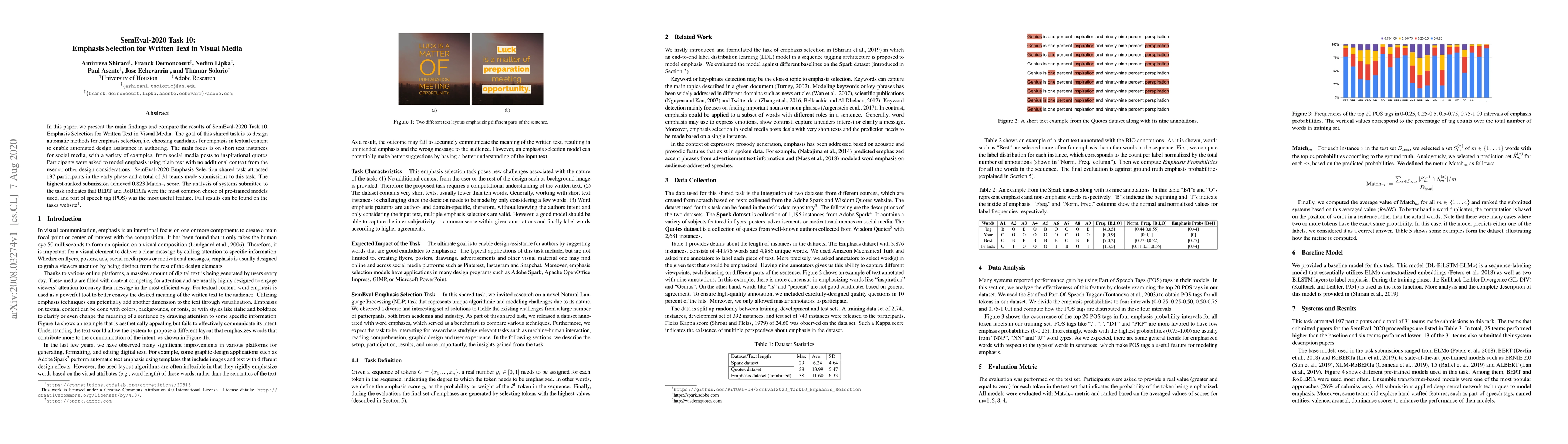In this paper, we present the main findings and compare the results of SemEval-2020 Task 10, Emphasis Selection for Written Text in Visual Media. The goal of this shared task is to design automatic methods for emphasis selection, i.e. choosing candidates for emphasis in textual content to enable automated design assistance in authoring. The main focus is on short text instances for social media, with a variety of examples, from social media posts to inspirational quotes. Participants were asked to model emphasis using plain text with no additional context from the user or other design considerations. SemEval-2020 Emphasis Selection shared task attracted 197 participants in the early phase and a total of 31 teams made submissions to this task. The highest-ranked submission achieved 0.823 Matchm score. The analysis of systems submitted to the task indicates that BERT and RoBERTa were the most common choice of pre-trained models used, and part of speech tag (POS) was the most useful feature. Full results can be found on the task's website.
